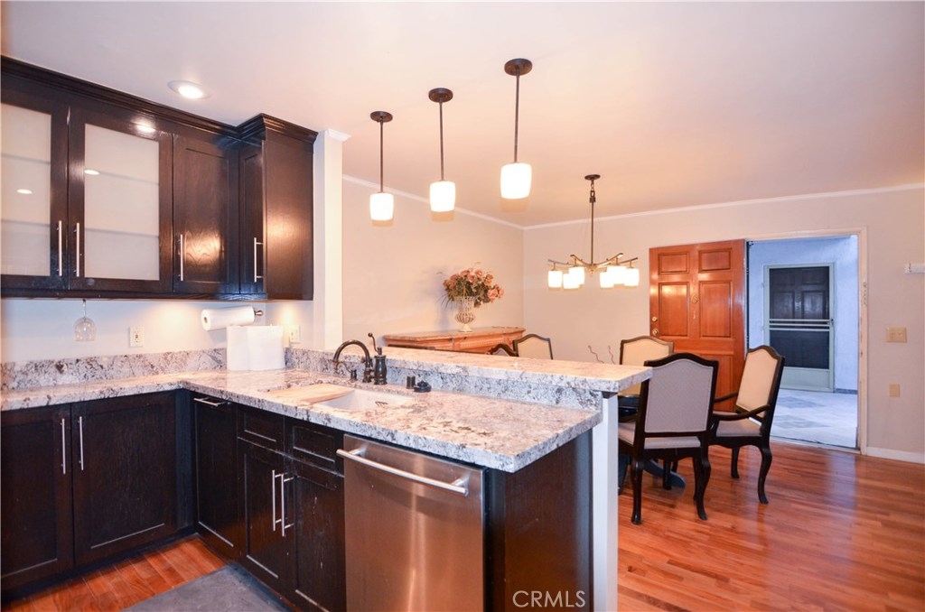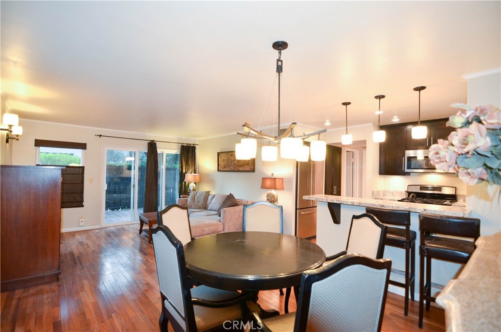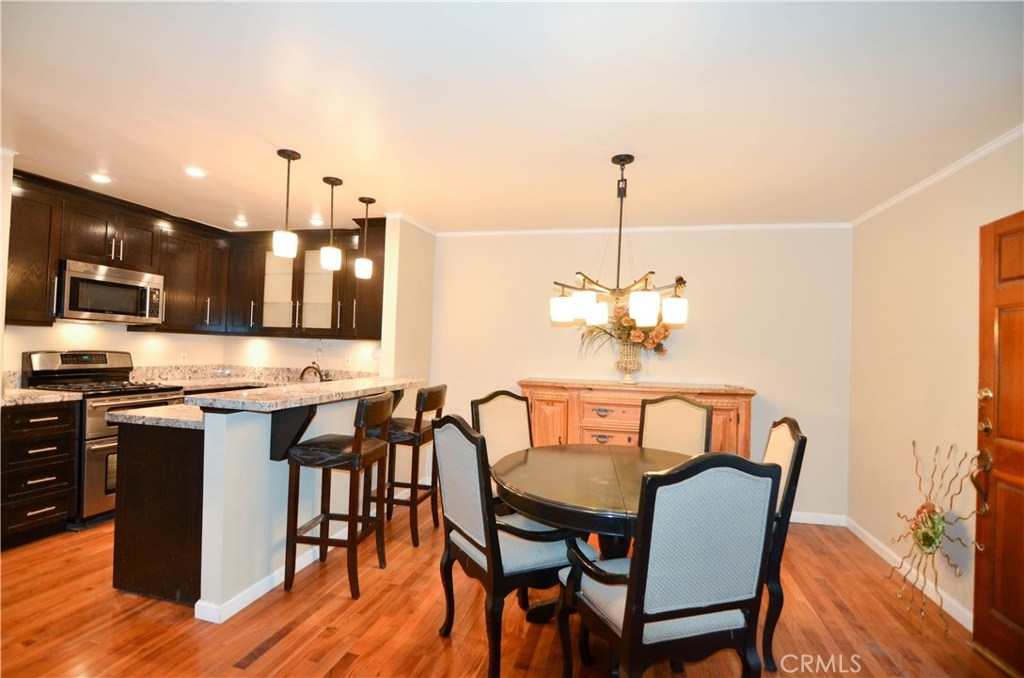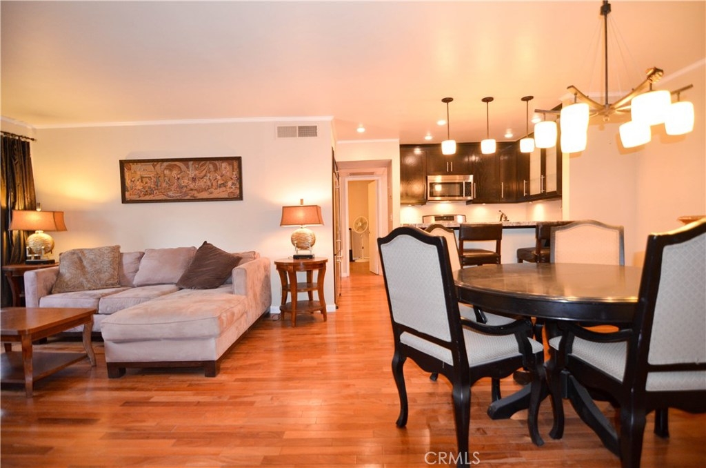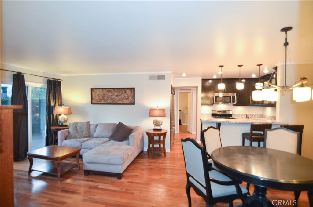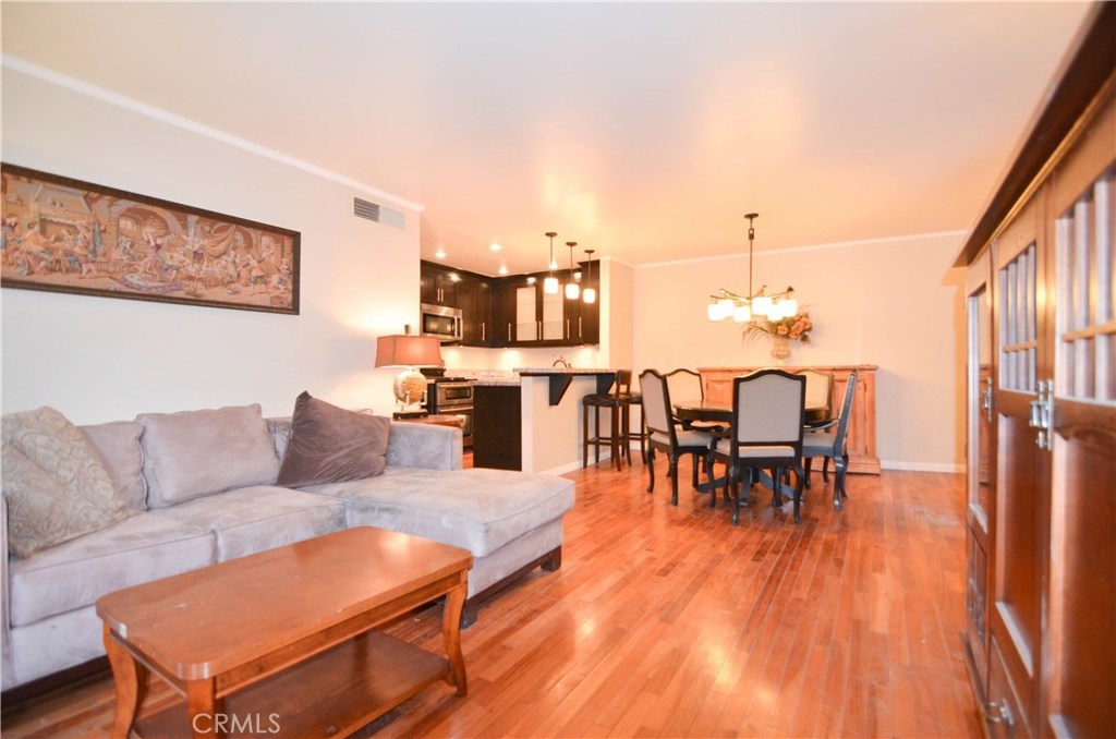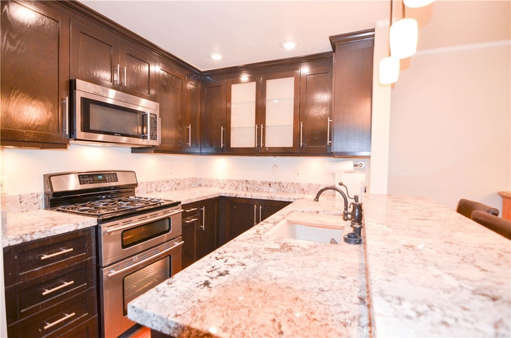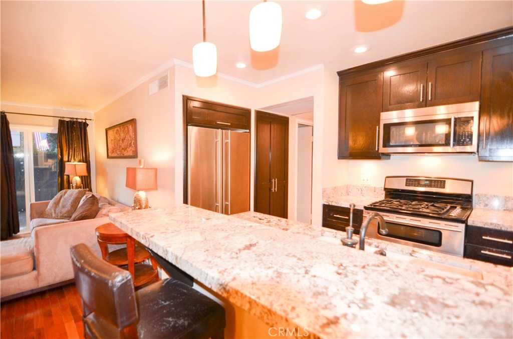 REDUCED Owner wants it sold ASAP! TOTALLY REMODELED and shows like a MODEL HOME with upgraded kitchen, beautiful granite counter tops, custom espresso cabinets, Jenn-Air Appliances Built-In French Drawer Refrigerator, Double-Oven, Dishwasher, Convection Microwave, Kohler Porcelain Extra Deep Sink, lots of extras! Lazy Susan pull out, under cabinet halogen lighting, and under cabinet wine glass rack, pull out caddy under kitchen sink and lighting over bar. Wood floors in living room, dining room, kitchen, and hallway. New Ceramic Wood floors in the bedrooms and patio. Upgraded patio door and large window in living room, patio door opens on both sides, Professionally designed closets in both master bedroom closets. Large, private patio with storage. NEW A/C installed in 2015. The Clubhouse has a gym, pool table and lots of comfortable seating to read or relax. Pool, Spar and newer stainless BBQ’s. Seller just spent thousands on new flooring and other upgrades. Large, well-maintained laundry facilities. Property has lots of trees and ponds throughout. Tandem covered parking with storage area. This is a gated community. Close proximity to Gelsons, Vons, Whole Foods, Coffee shops and much more. Assessor shows property as a one bedroom and den since closet was used to expand the kitchen. Possibly a closet may be added to the den. Also One bathroom and a toilet and a separate room with sink only for a total of 1.25 baths.