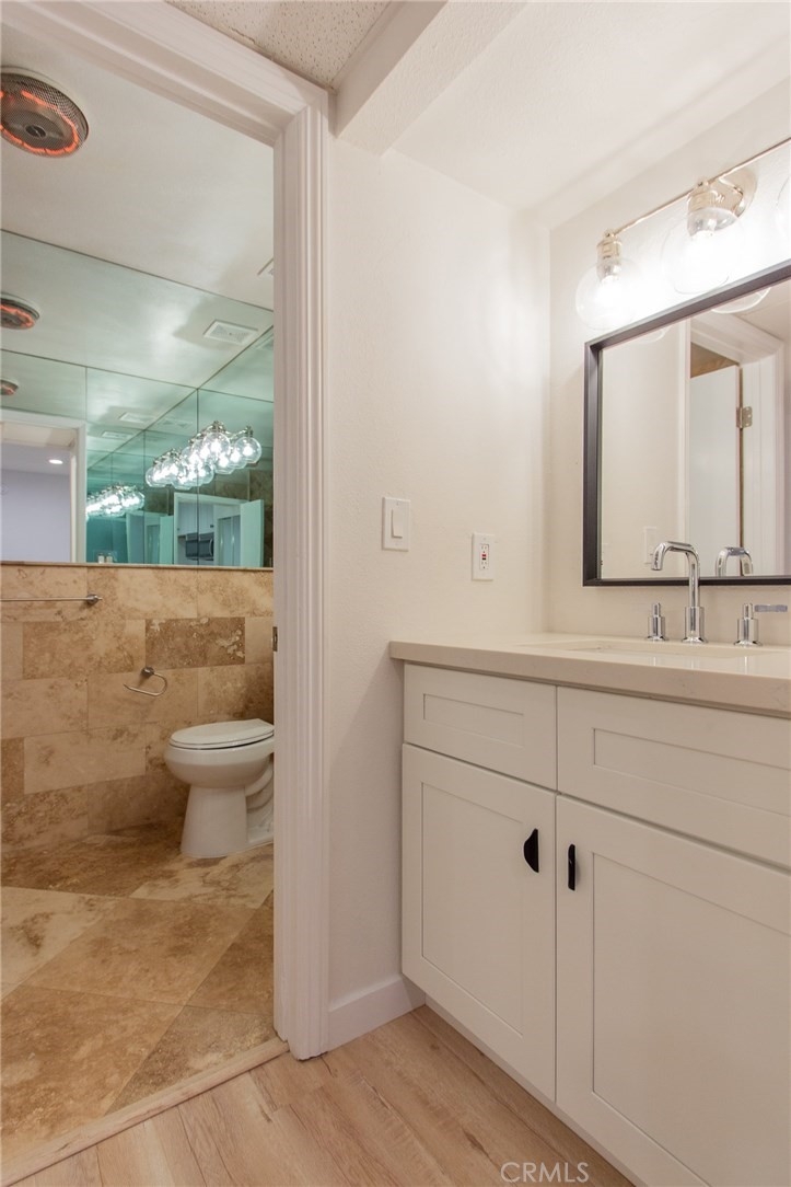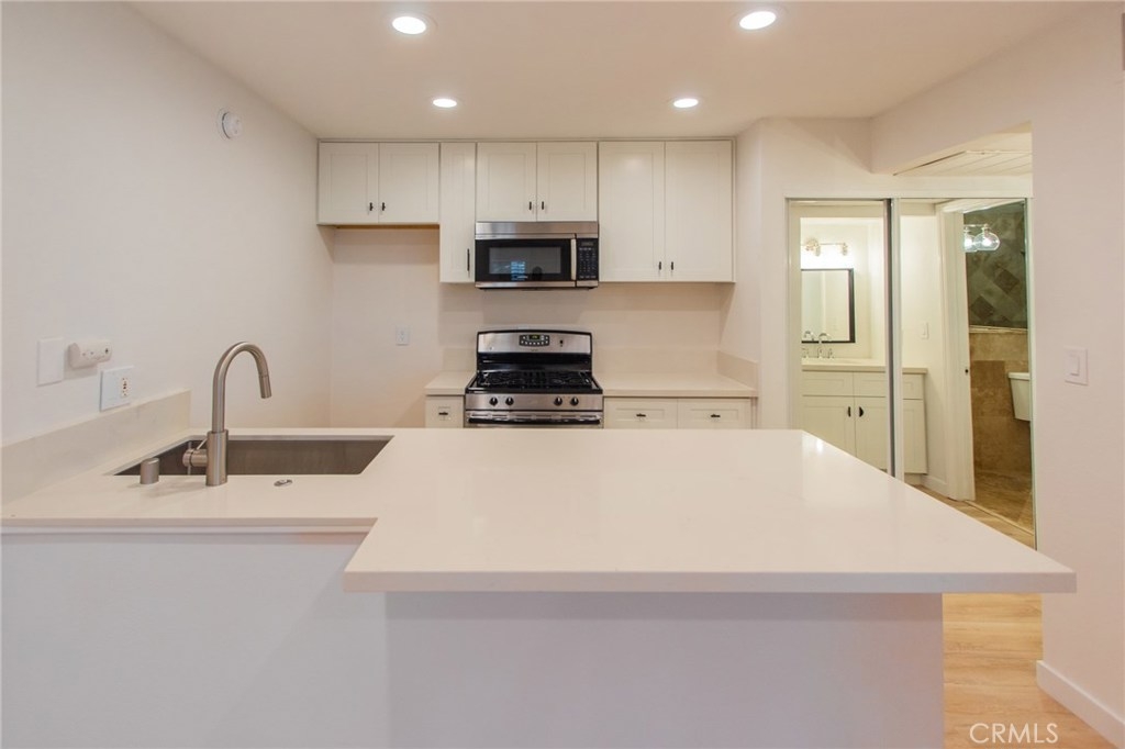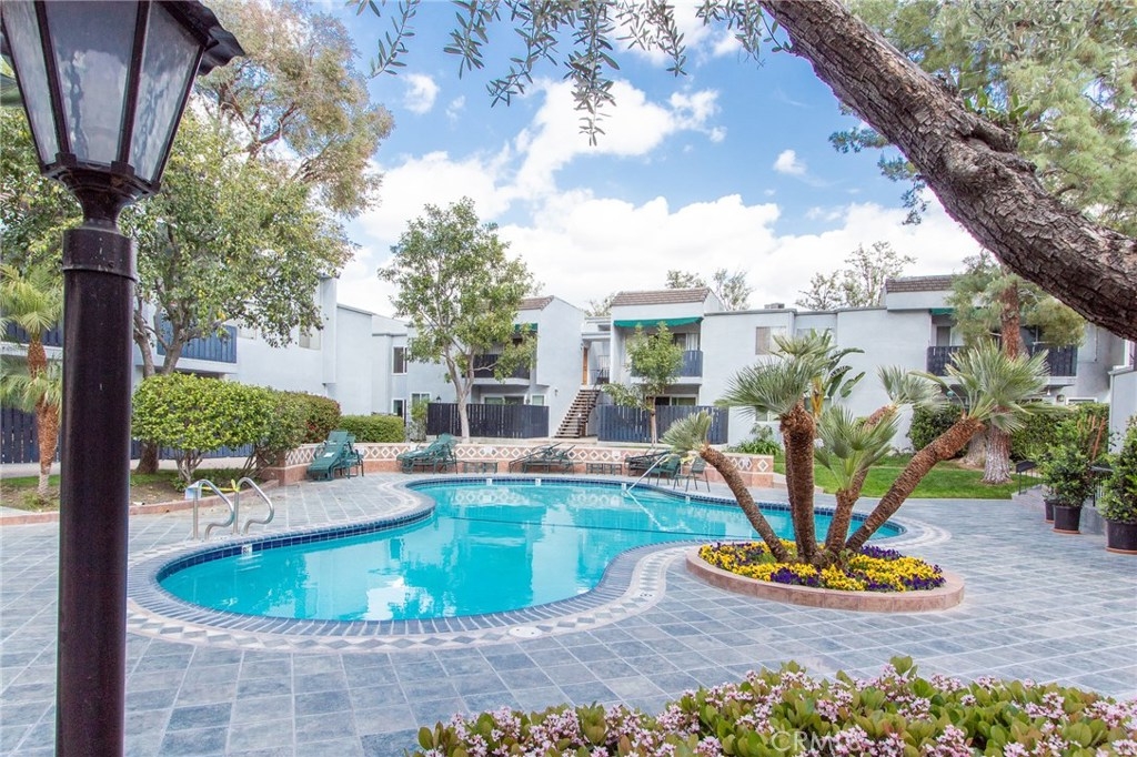 Bright and open first floor unit located in a very well maintained private association which offers access to sparkling pools, sauna, gym, laundry rooms, and landscaped areas. This upgraded home features a private patio, recessed lighting, custom cabinetry, new flooring and paint throughout. The remodeled kitchen has bar seating, quartz countertops, new fixtures, and stainless steel appliances. Comes with one assigned carport space.