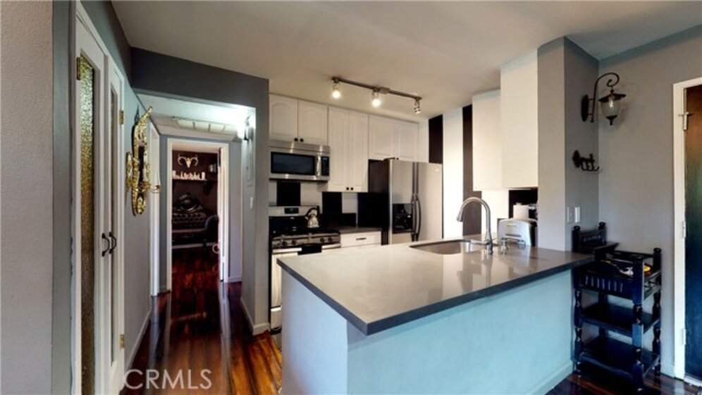 Move right into this dramatic, remodeled, 2 bedroom 1.25 bath Tarzana top floor California Place condominium. Gleaming laminate flooring. Remodeled kitchen with white cabinets, grey quartz countertop, and stainless steel appliances which overlook the dining area with recessed lighting. High ceilings adorn the spacious living room. Remodeled bath with glass sinks. Master with walk-in closet plus an additional closet with built-ins. Balcony. 2 parking spaces (tandem). Enjoy the resort style living California Place has to offer including sparkling pool, spa, sauna, recreation room and BBQ area. Don't miss seeing this absolute turnkey condominium located close to shops and restaurants.