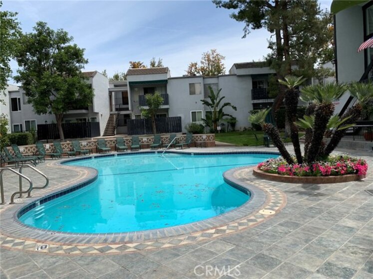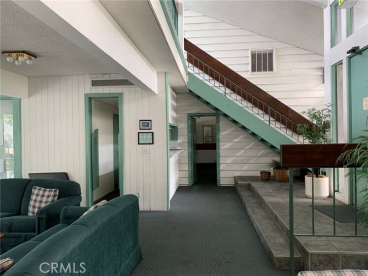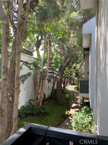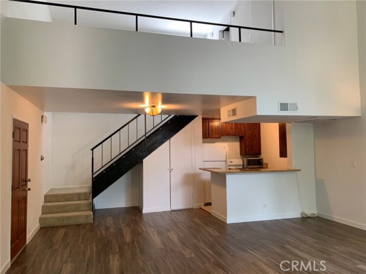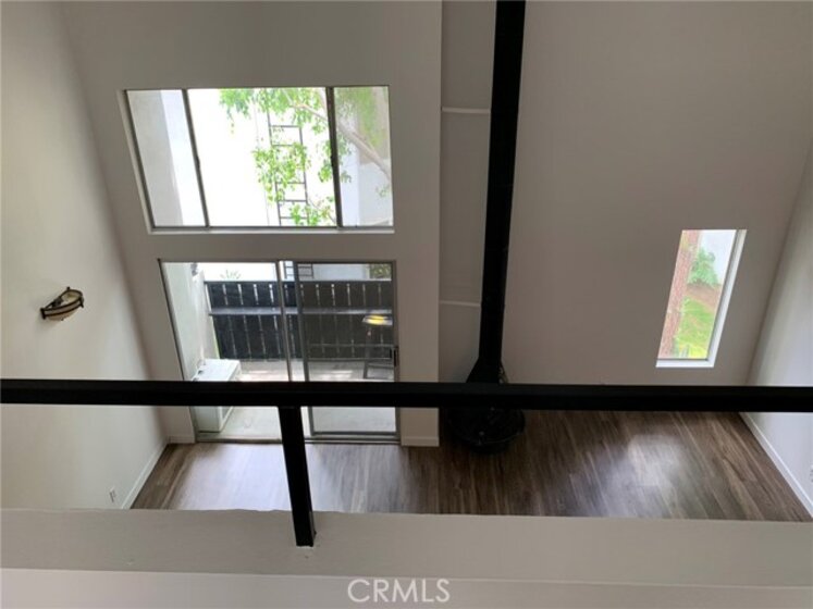 Another winner in the desirable California Place condominium complex. It is ideally located between the pool and parking, no street noise. Move in ready, this large (758 sq ft) contemporary, upper unit has unbelievably high ceilings and lots of natural light. Surrounding trees offer privacy and a beautiful view from your balcony, living room or bedroom loft. The interior is freshly painted with Whisper Grey paint throughout, new Greige carpet in the bedroom, new brown/grey wood laminate flooring. Flooring under-layment is Shaw's top of the line "Groundworks". Floor is easy care, cushioned and quiet. Built in pantry/closet under the stairs. The carpeted bedroom loft includes a walk in closet and updated bathroom. Gated and secure, guard on premises, quiet complex, manicured park-like grounds, pool & spa, bbq area, recreation room, laundry room. It's all here! HOA fees include water, gas, trash, earthquake insurance, grounds maintenance, cable hook up.