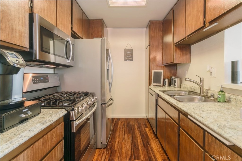 Your buyers will love this recently updated condo which has 3 bedrooms and two bathrooms in just over 1000 square feet. Immediately when you walk in this second story condo you see the beautiful wood floors and soaring ceilings and you will be flooded with natural light. The dining area is conveniently located adjacent to the kitchen in an open concept living/dining room. The kitchen has upgraded stainless steel appliances, all which are included with the home. The large living room has a private patio to enjoy your morning coffee or tea. Down the hallway, you will find a full bathroom that has been tastefully updated last year that features oil rubbed bronze fixtures, subway tile, and a granite vanity. The master bedroom has an en-suite bathroom that has been updated with the same tasteful design. Summers will be a breeze with the newly installed Lennox air conditioner and heater, all controlled by a smart thermostat! Downstairs you will find a convenient and close laundry room, large gated pool and huge spa. The grounds are lush with mature landscaping and lots of trees. Trader Joe's, CVS, Gelson's and many more shops are minutes away! Don't miss this great condo!