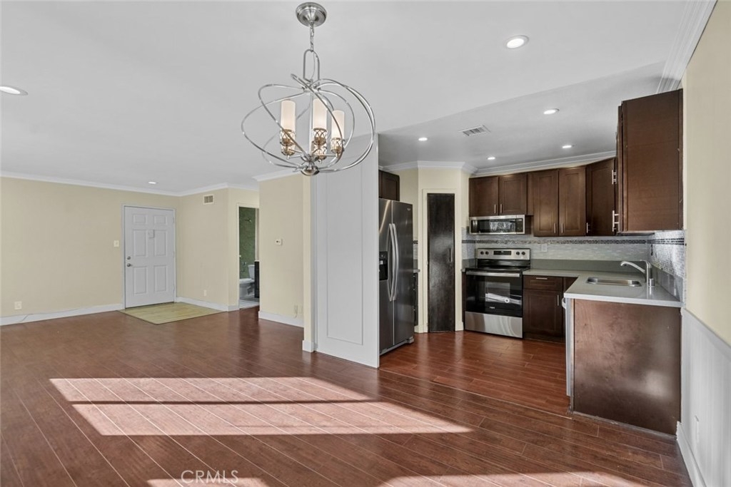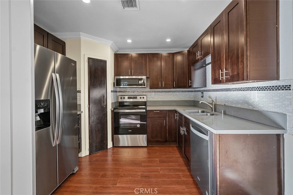 A spacious and airy 3-bedroom, 2-bathrom, condo in Tarzana is a lovely home just waiting to become yours! Set at towards the back of this gated complex is unit B27 that boasts beautiful laminate floors and elegant accent and crown moldings highlighted by the all-around recessed lights. The bright living room with adjoining dining room leads into the open kitchen complete with all brand-new stainless-steel appliances, stone counters with a complimenting tile backsplash, and a pantry nook. All bedrooms have built closet storage featuring mirrored sliding doors. The master bedroom incorporates two large closets and an en-suite bathroom complete with a spacious vanity top and tiled walk-in shower. Across from the main bathroom, which houses a shower/tub combination, is a large walk-in closet that’s ideal for linens, coats, extra storage, or anything else to suit your needs. Outside, the complex provides the unit with 2 parking spaces, a community laundry room, community pool, spa, rec room, and a wonderful playground plus a basketball court! HOA includes water, sewer, landscaping, common areas, earthquake insurance, and basic cable. Down the street from Tarzana Square Shopping Center, medical offices, Whole Foods, shops and dining along Ventura Blvd, easy freeway access, and more! Text Linda today!