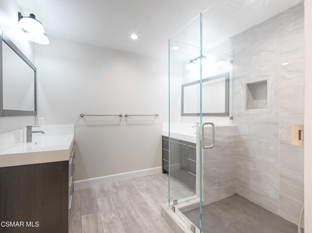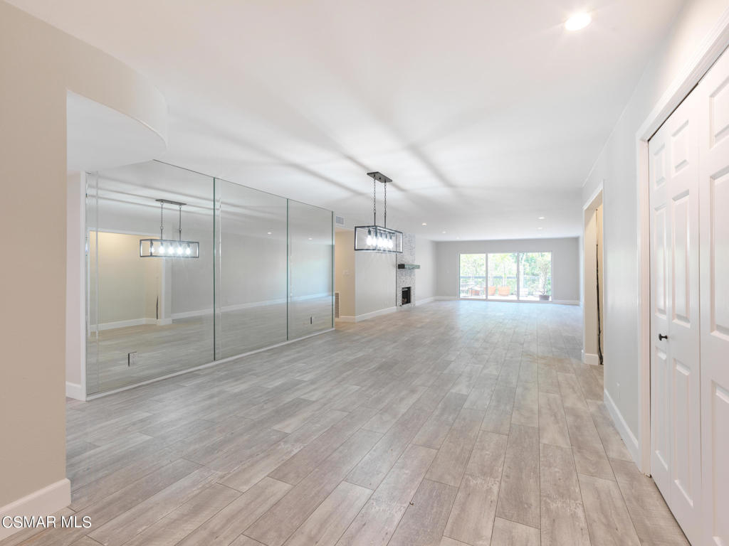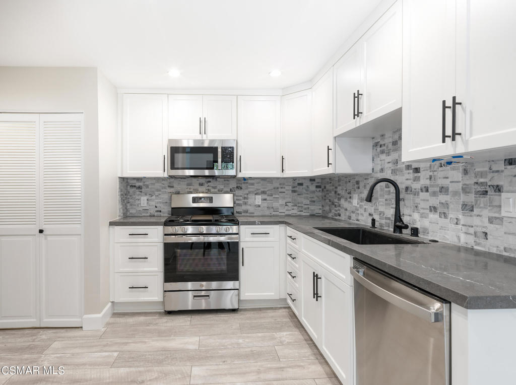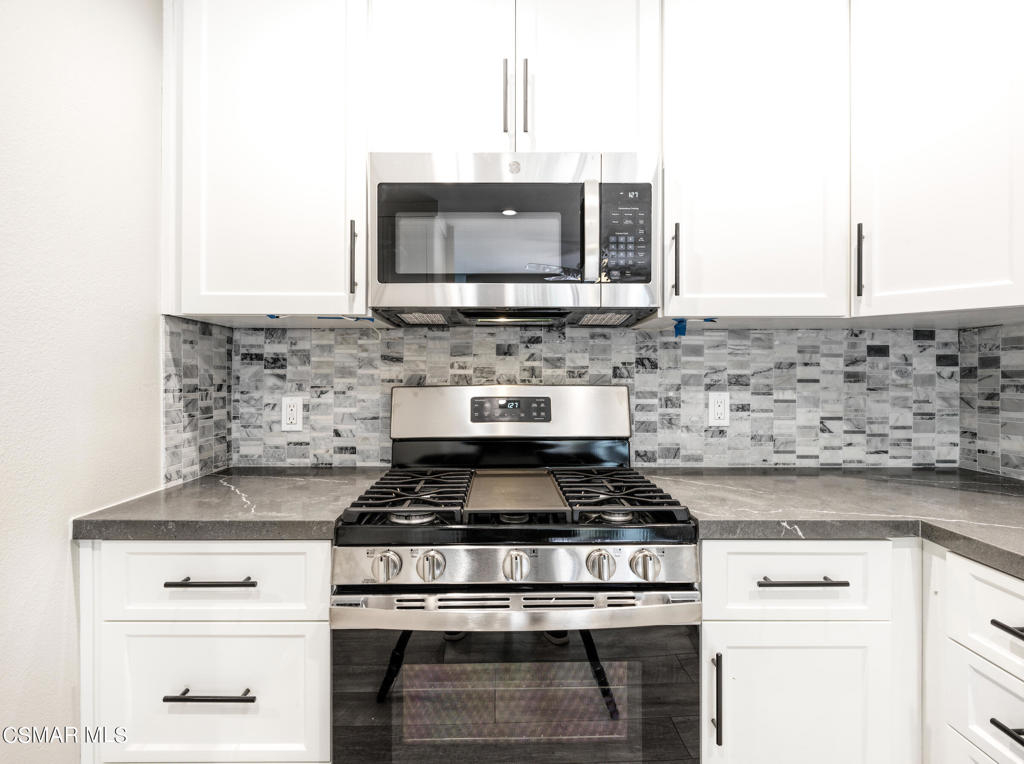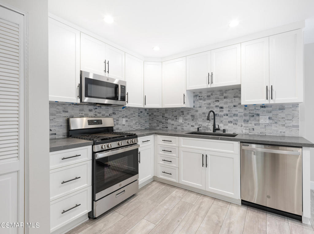 Redesigned, single-story condominium boasting over 2,000 square feet with a private and spacious terrace with room for al fresco dining and entertaining with views of lush, mature landscape.Sleek and modern interior features a great room with an impressive dining area and living room with fireplace opening to the terrace. Crisp, white kitchen with stainless steel appliances, custom counters and backsplash, hide-away laundry area, walk-in pantry and breakfast room.Spacious area adjacent to the kitchen with many possibilities such as den, home office, media room, etc...Two primary suites each with their own primary bath and walk-in closet.Additional features include wood-like floors, fresh paint, smooth ceilings, recessed and custom lighting, and tons of additional storage space.Well maintained common areas with controlled access entry.Gated parking garage offering two parking spaces(side by side).Community pool, spa, sauna, recreation room and outdoor BBQ. Great location near shops, markets and restaurants.