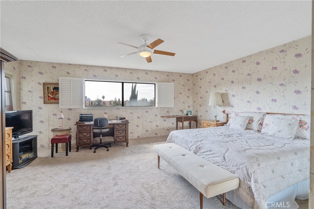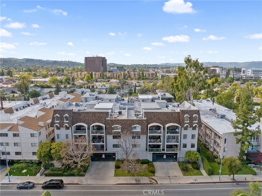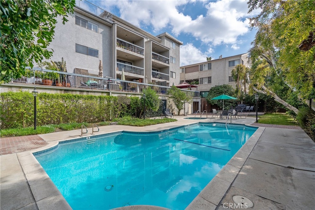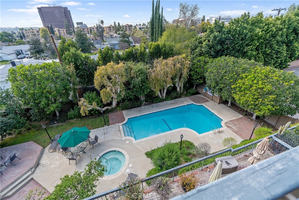 This top level, LARGE rear unit cannot be beat! Enter and be mesmerized by the natural light flooding into the unit and admire the high ceilings and all the space it creates. This unit has the potential to be your dream unit. One of the best units in the building, this condo and its generous balcony overlooks the pool, spa, condo grounds, and the hills of Tarzana. With almost 2,400 sf and huge ceilings, you can imagine living life to its fullest. Enjoy the fireplace and wet bar in the main living space, which features an oversized living room with 20+ foot ceilings, a spacious dining room to host all of your guests and a comfortable den. Enjoy your breakfast next to your kitchen and look out one of the two balconies this unit offers. The primary bedroom is larger than most that you will see in the area, has two walk-in closets, an additional mirrored closet with built-ins, and a door that leads to the rear balcony so you can enjoy fresh air or the sunset from your bedroom. The primary suite includes a bathroom with a stall shower, large separate soaking tub and two separate sinks with space for a vanity. The other bedroom on the main floor offers a walk-in closet and another full bathroom. Upstairs, you will find a third bedroom/loft with a large closet and its own full bathroom. This bedroom has one open wall, and can easily be closed off for added privacy, but would also be great as-is for an office, TV or guest room. This upstairs bedroom has a large sliding door that leads to a rooftop deck that will allow you to enjoy fantastic views of the Tarzana hills. This condo feels like you're in a private home with tons of closets and storage space. Leave your car in one of the two side-by-side parking spaces and close to the boulevard for shopping, dining and places of worship. Ready to put your own stamp on something? This unit could be for you!