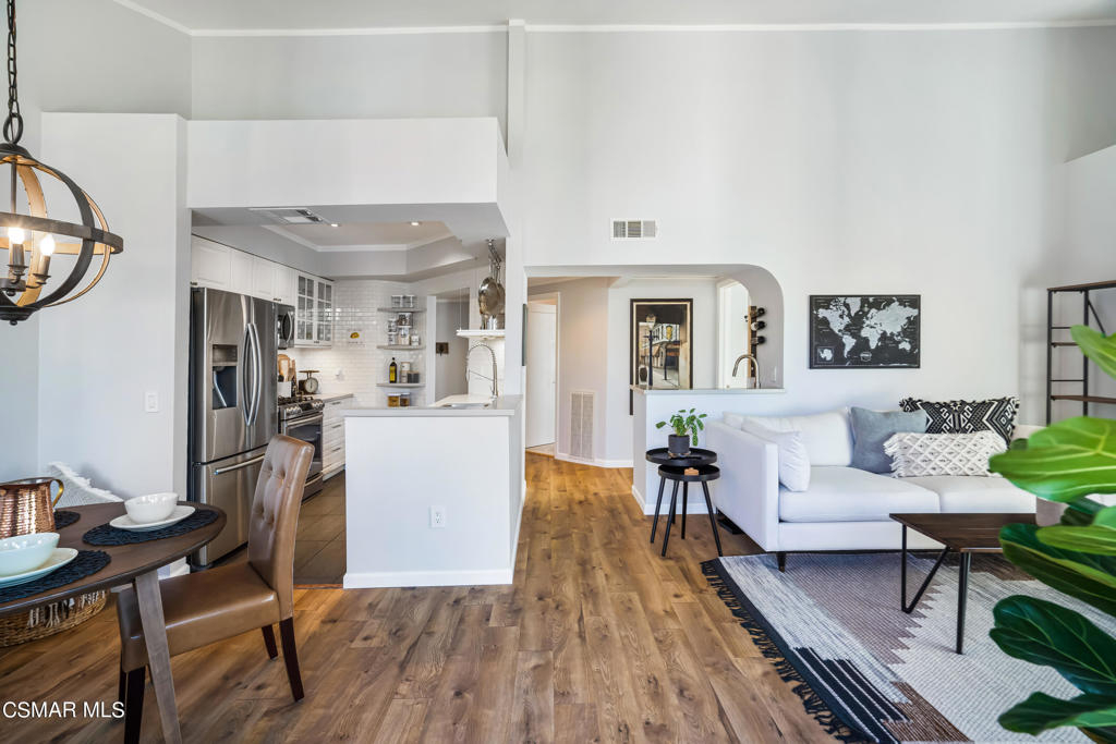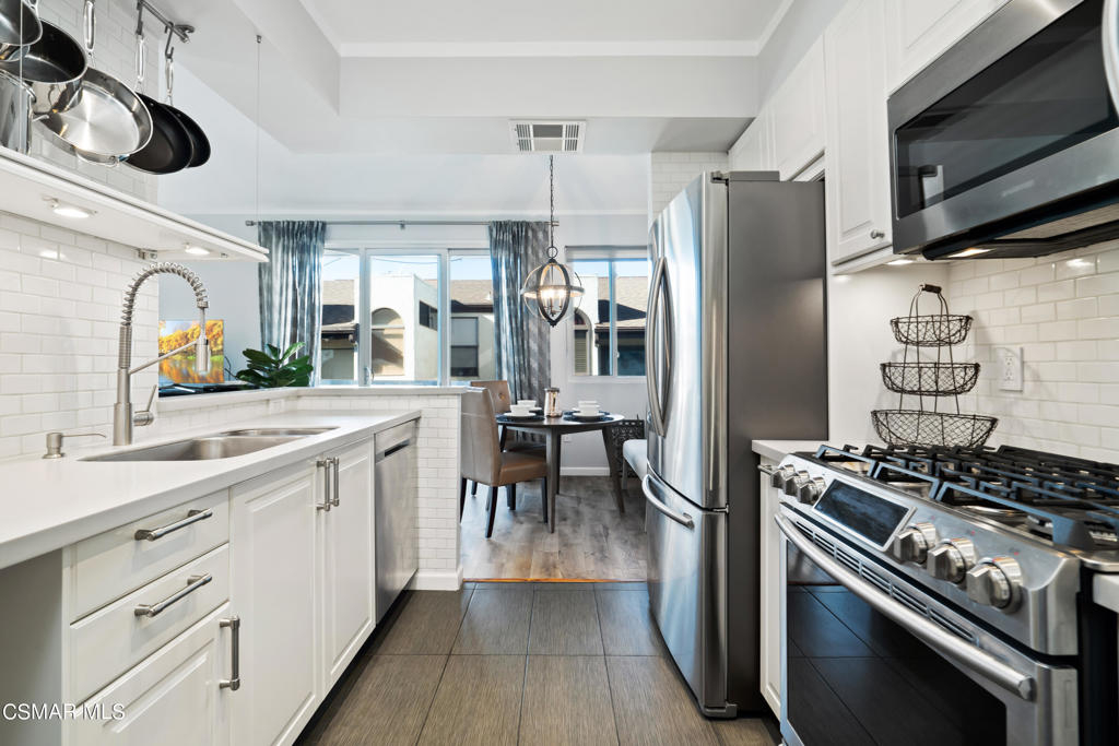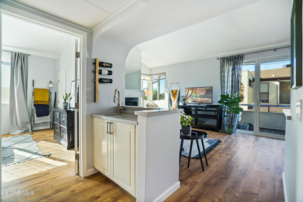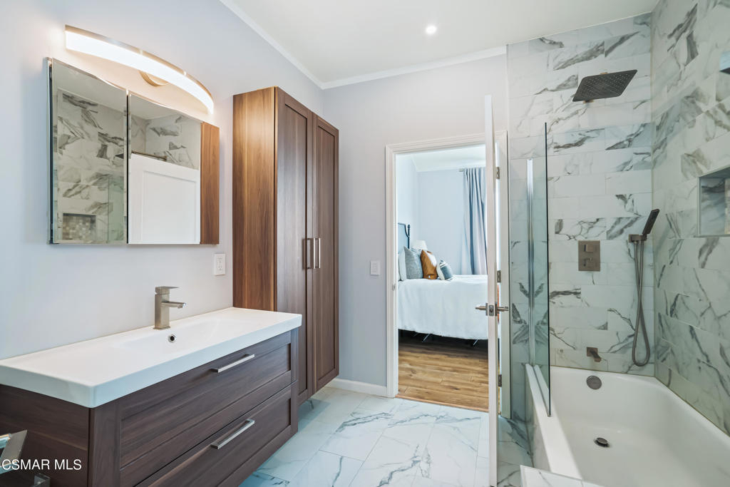 Welcome to this modern 1 bed 1 bath unit located in Tarzana. As you enter the gated community you will be graced with quiet, well maintained grounds which has a courtyard with a relaxing water feature. Upon entering the property, you will immediately notice the open floor plan, soaring ceilings, wet bar, and abundance of natural light. Unwind after a long day next to the cozy fireplace or on the private balcony. The chef's kitchen comes equipped with recessed lighting, stainless steel appliances, custom cabinets, and sleek white subway tile backsplash. Enjoy hosting family and friends for dinner in the dining area that has a custom light fixture. The master retreat features a custom vanity mirror, walk-in closet, storage cabinet, marble shower and floors. For added convenience the home features 2-car tandem parking in a gated garage #206 and #199, central A/C, community pool, mailbox, laundry room and elevator. Conveniently located close to shopping, hiking/biking trails, and fwy access. This is a great place to call home!