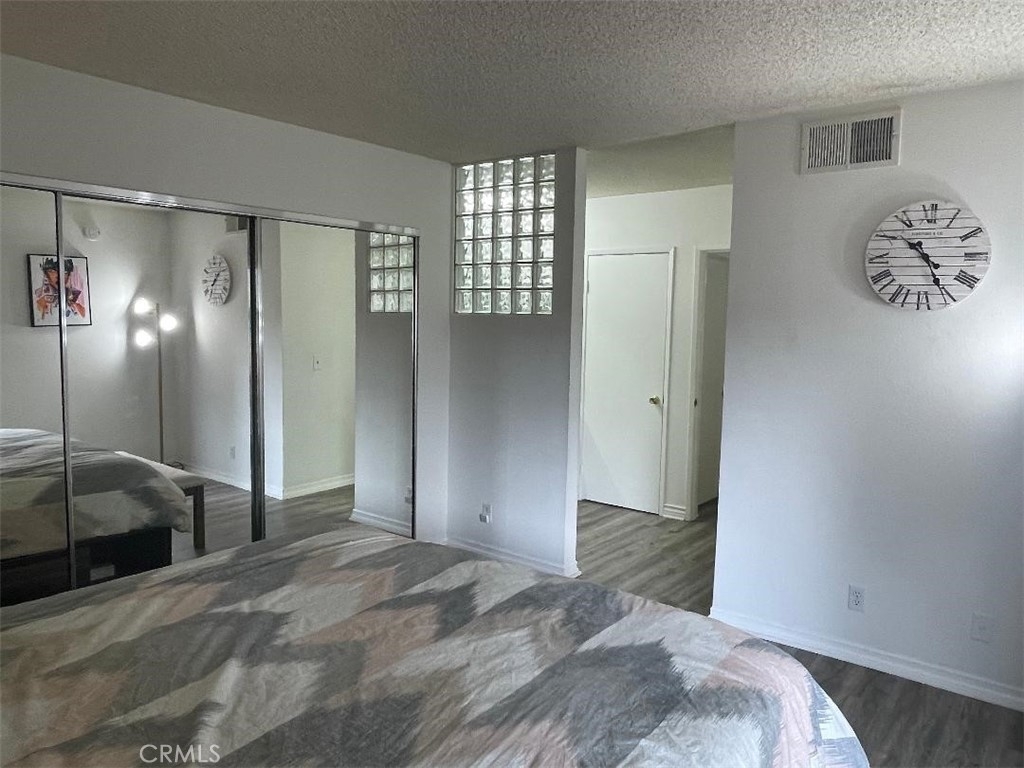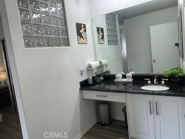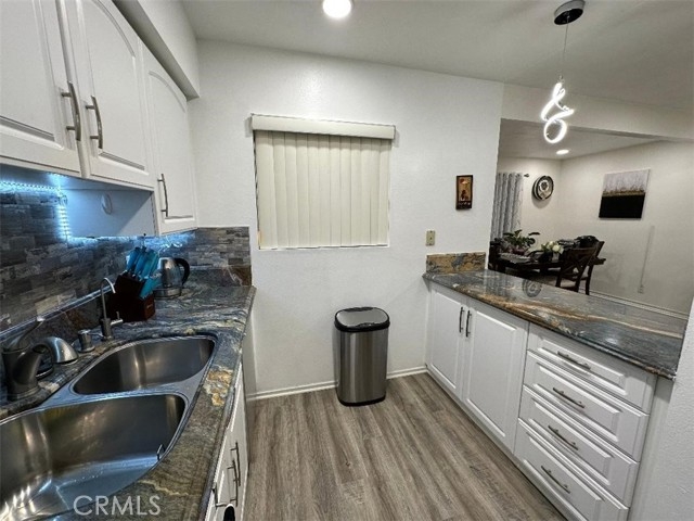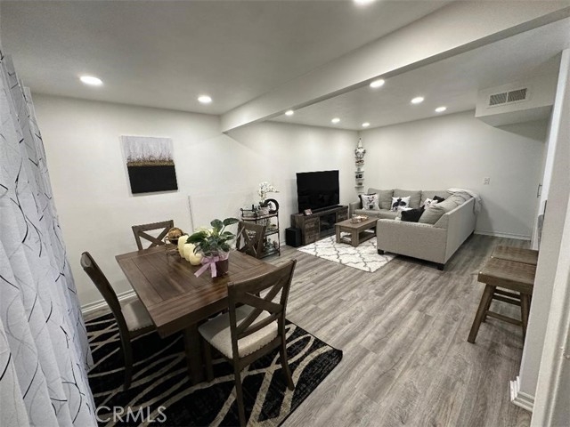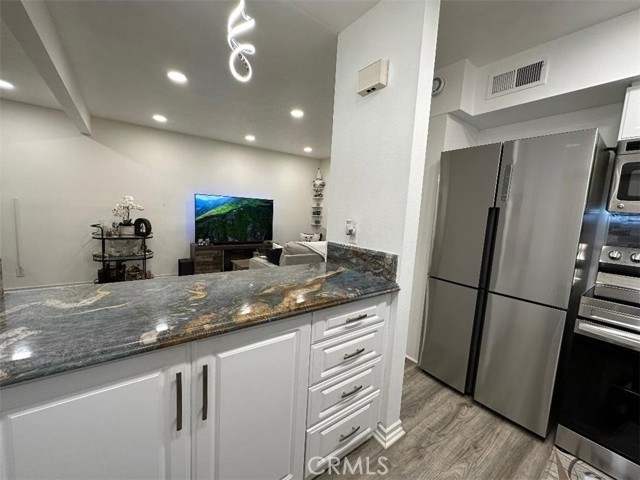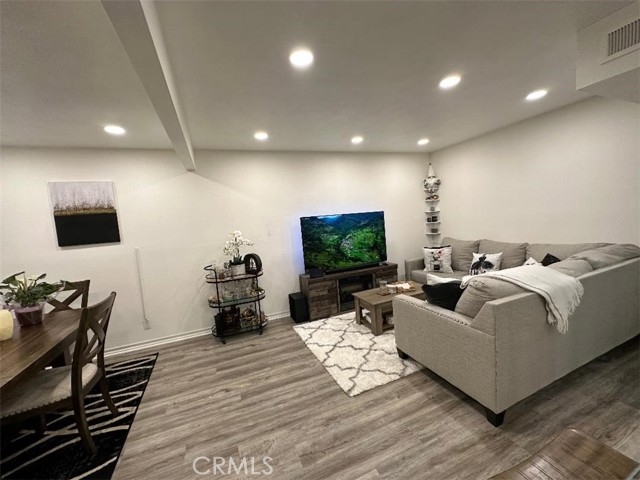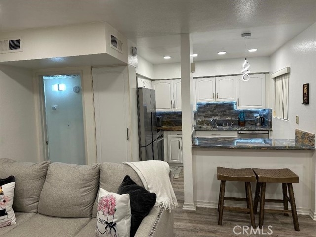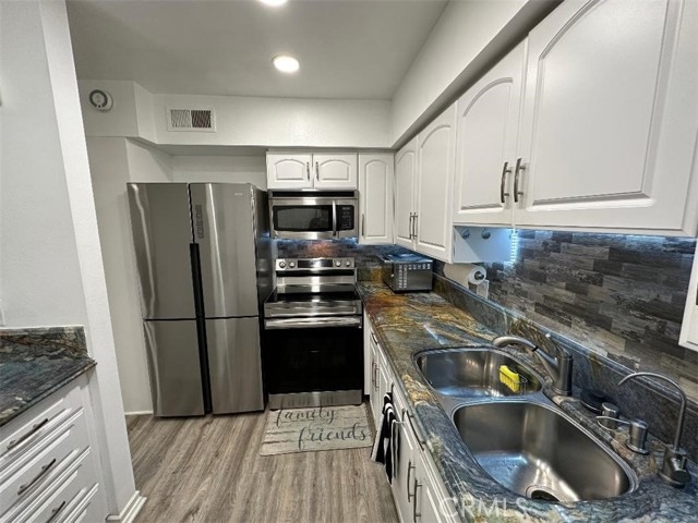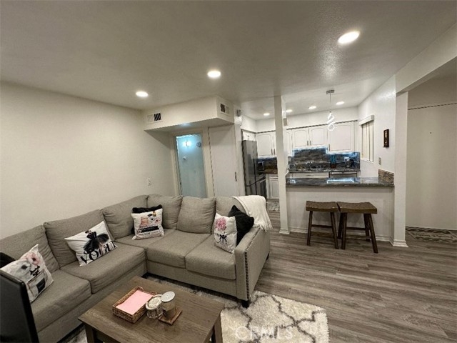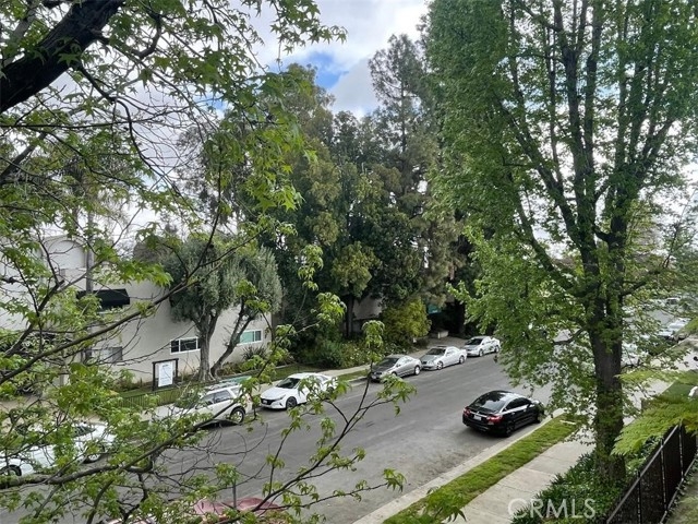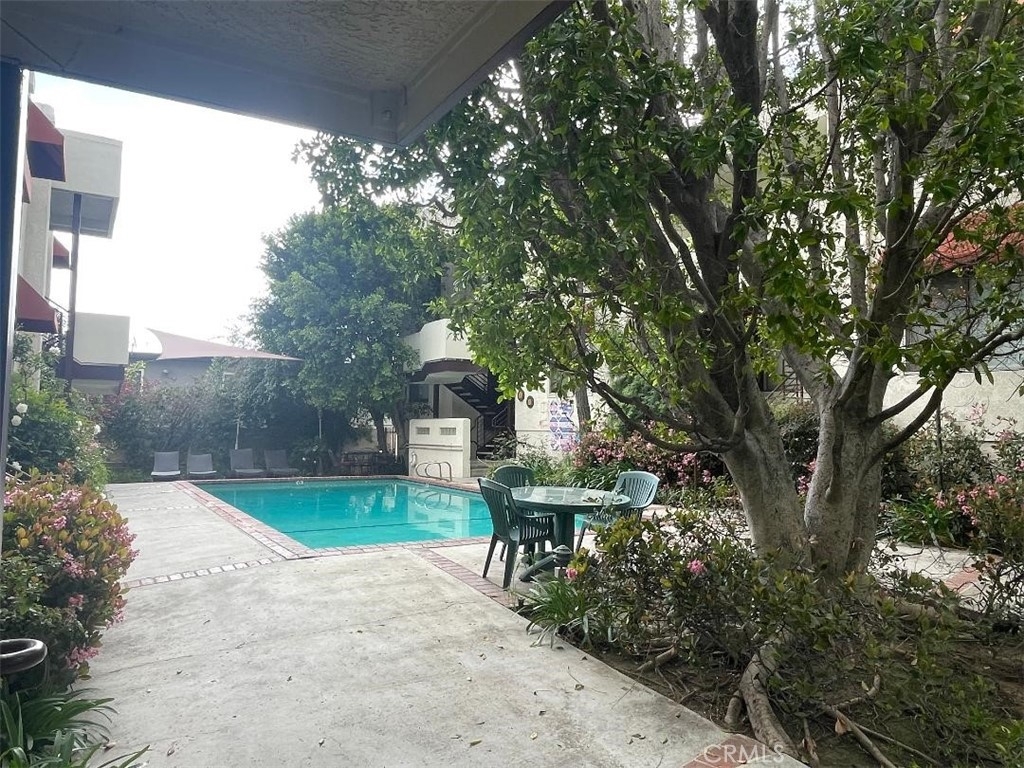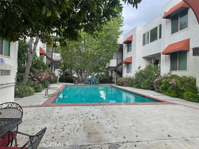 Well maintained and security gated Condominiums. This 2 bedroom, 1 bath unit is on the top floor. Updated kitchen has stunning “Van Gogh Blue” counters with white cabinets, Recessed lighting and built-in appliances, dishwasher, plus an electric stove and microwave are included. A breakfast bar separates the open concept. Recessed lighting in living room and dining room. stunning laminate flooring in living/dining rooms, bedrooms, hall and bathroom. Good size master bedroom has a private vanity area with sink, separate from the full bathroom, allowing 2 people to get ready for work at the same time! Both bath areas have cabinets and stunning black granite counter tops. Both bedrooms have sliding doors to the private patio. Two car tandem covered parking spaces close to the stairs leading to the unit. Parking area is also gated. Central heat and air. The complex offers additional storage room for this unit at no additional cost. The unit is approx. 5x5x8, and there is more space for storing your bicycle. There is a community laundry area. Community pool includes patio tables & chairs and lounging chaises. A short walk to shops and restaurants on Ventura Blvd.
