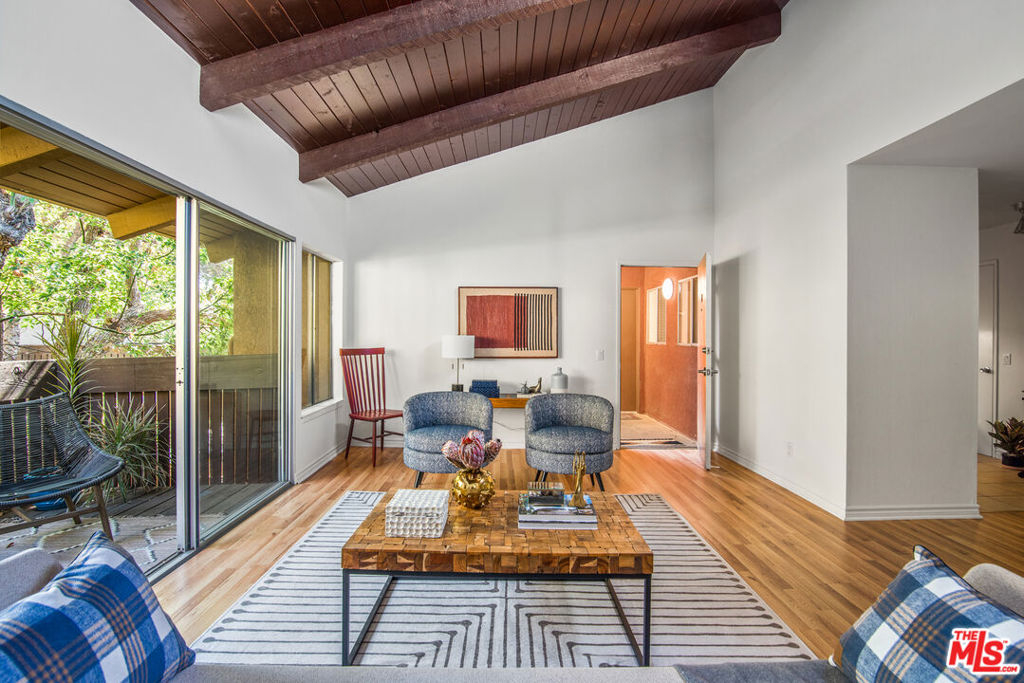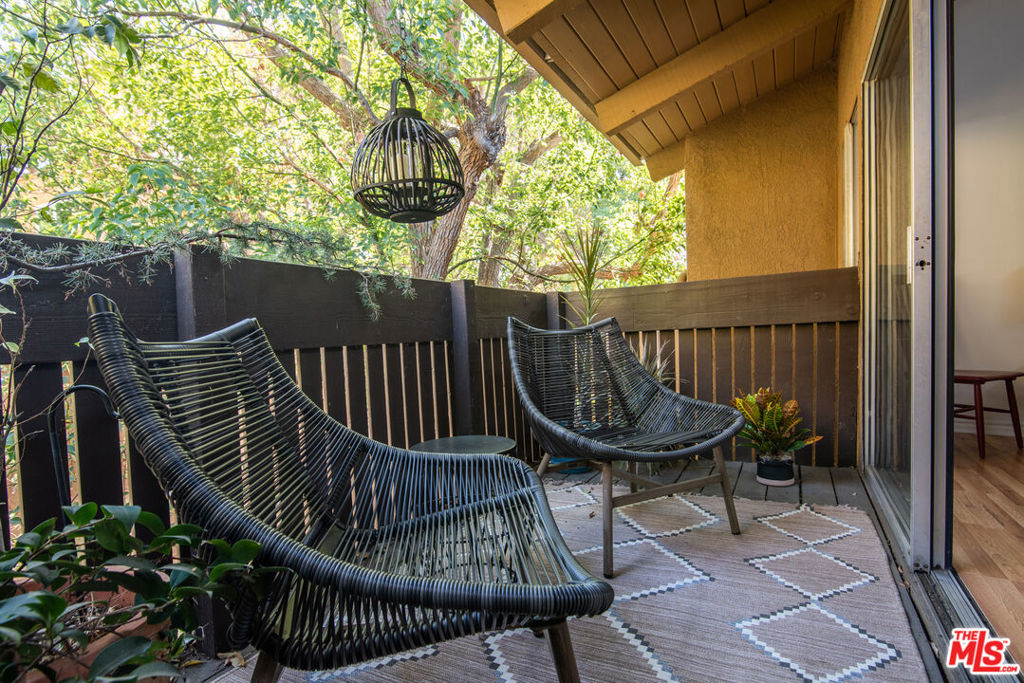 Located in the heart of Tarzana, close to Ventura Blvd & its eclectic offering of shops & restaurants, sits this beautiful condo in a gated complex. A vine covered trellis & towering California sycamores lead to the second-floor unit. Once inside, open beam ceilings, glass slider & clerestory window allow light to pour in from every angle. Hardwood floors dance across a blended dining & living room, opening to a balcony overlooking a symphony of verdant beauty. Just beyond, a remodeled kitchen comes replete w/modern cabinetry, stone counters & stainless-steel appliances. Two bedrooms + 2 updated baths, includes a light-filled ensuite w/mirrored closet sliders & walk-in shower, whilst inside laundry adds convenience. Amenities include gated access, heated pool + spa, BBQ area & meandering paths under canopies of trees. Central HVAC & 2 parking spaces complete this immaculate offering.