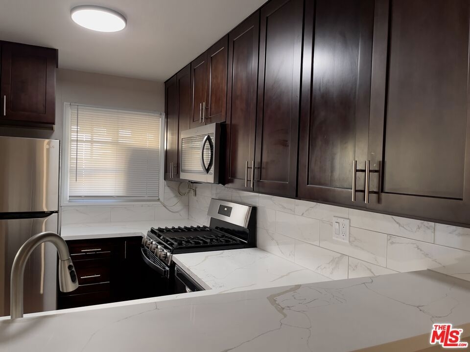 This cozy one bedroom has been completely remodeled! This includes freshly repainted walls and ceilings, custom sized kitchen cabinets, new vinyl flooring, new tile, quartz kitchen countertops and fully remodeled bathroom. Brand new stainless steel appliances and new light fixtures and hardware have been installed. Located in a gated building, this apartment is conveniently situated on the lower level, right next to the main entrance and has its own balcony. Community pool and picnic area are on site with 2 communal laundry rooms on each floor. Complex is closely located to the 101 freeway and public transportation.