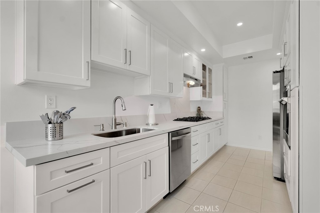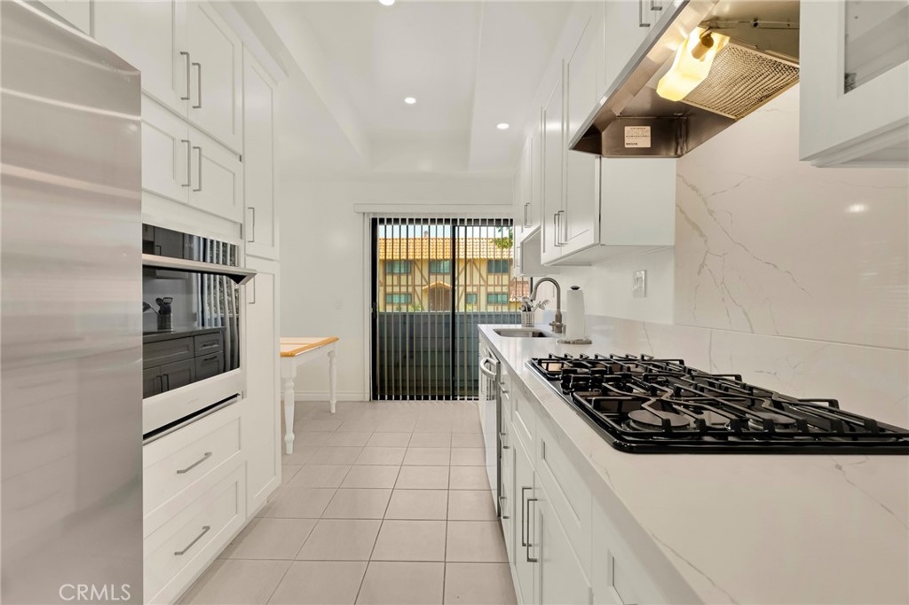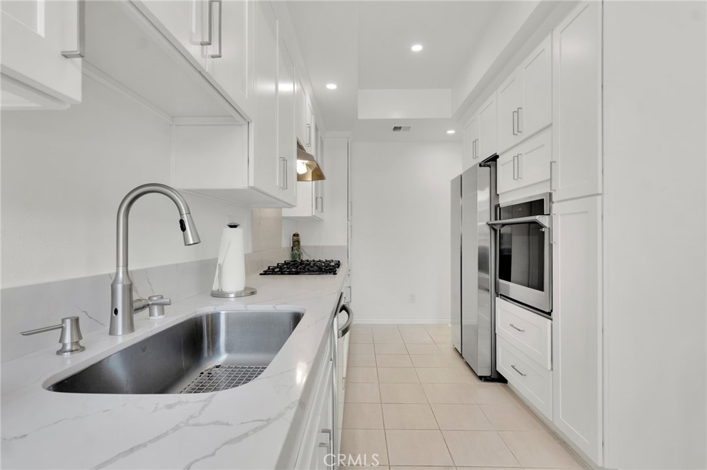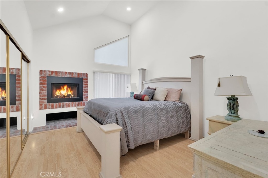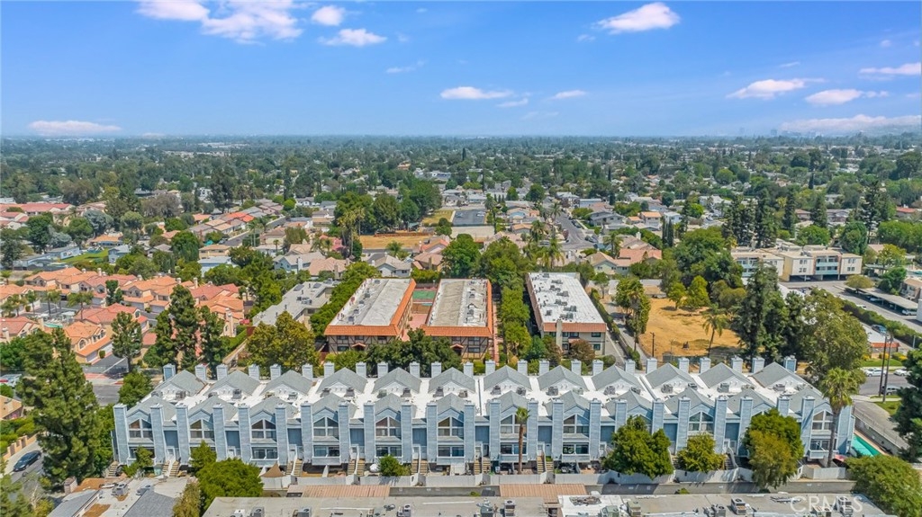 This beautifully updated two-story townhome offers nearly 1,350 sq ft of light-filled living space with soaring ceilings, recessed lighting, and a thoughtful layout designed for both comfort and style. A private entrance opens to a spacious foyer and a modern kitchen featuring white shaker cabinets, marble-like quartz countertops, and stainless-steel appliances including a built-in gas range with hood, gas wall oven, dishwasher, and refrigerator. The adjoining breakfast nook leads to a charming front-facing balcony, while the formal dining room and living room are connected by a unique center atrium accessible from both spaces. The living room boasts a gas fireplace, sliding glass doors to a rear balcony, and direct access to the private, fenced backyard—a blank canvas ready for landscaping, a patio, or both. Upstairs, the primary suite impresses with cathedral ceilings, a raised gas fireplace, wall-to-wall mirrored wardrobe, and a full en-suite bath with updated dual-sink vanity. The secondary bedroom also features cathedral ceilings and a mirrored wardrobe, with an updated full hall bath and side-by-side laundry closet conveniently located between the two rooms. Additional highlights include two tandem parking spaces in the gated subterranean garage, plus community amenities such as a pool and spa within a boutique collection of just 24 townhomes. Ideally situated in Tarzana near Ventura Boulevard’s eclectic mix of dining, shopping, and cafés, this home offers quick access to the 101 Freeway and popular outdoor spots like Tarzana Recreation Center. Assigned to highly rated Gaspar De Portola Middle School, this residence delivers a rare blend of stylish upgrades, outdoor living, and everyday convenience.