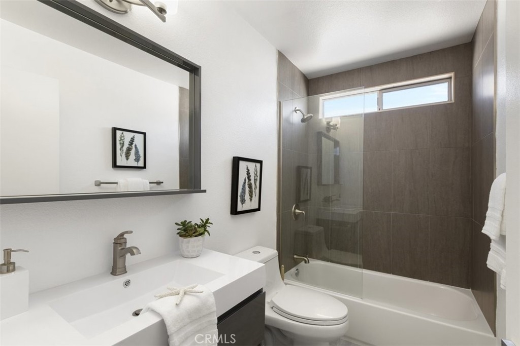 Beautifully remodeled END-UNIT designer townhome in “Tarzana Gardens” community. The tri-level 2 bedroom, 2.5 bathroom townhome is located at the back of the complex and it boasts gorgeous upgrades throughout. It offers freshly painted walls, remodeled kitchen, upgraded bathrooms, newer fixtures, custom closet built-ins, newer HVAC, and more! It has a private 2 car garage with direct access and a spacious bonus laundry room with new flooring. The fabulous kitchen features quartz countertops, stainless appliances with sleek range hood, newer cabinetry, breakfast bar, and pantry. The kitchen opens to the dining area, with a new glamorous chandelier. The family room has a cozy fireplace and a patio door opening to the private patio deck. There is a powder room on this floor. The top floor offers both bedrooms and 2 full bathrooms. The primary room has an attached updated bathroom and 2 closets, one with custom built-ins. The secondary bedroom has a huge closet with custom built-ins. The gated “Tarzana Gardens” community features a pool, spa, and tennis court. The HOA covers trash service, amenities, and exterior landscaping. Washer, dryer, fridge, and chandelier are included in the sale. Its prime location places it within minutes from Ventura Blvd, shops, restaurants, and freeway access.