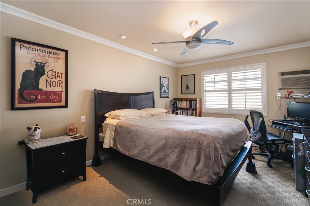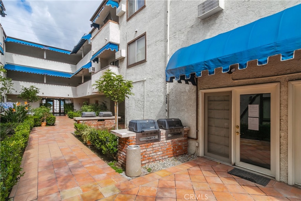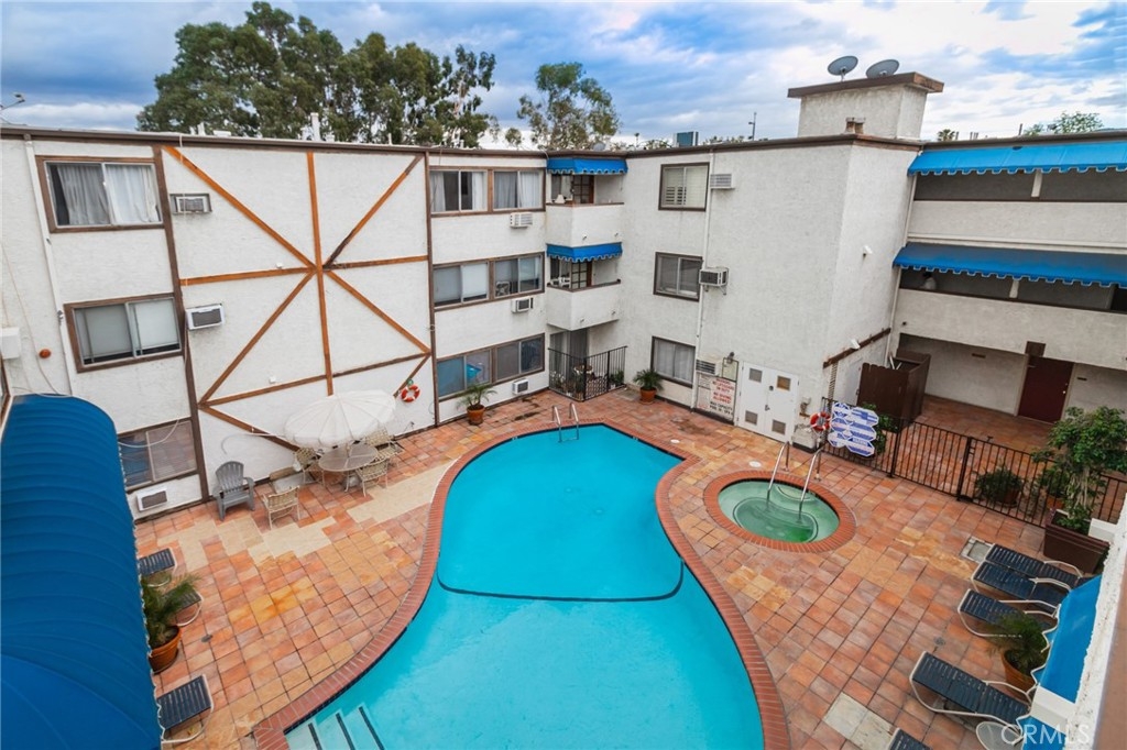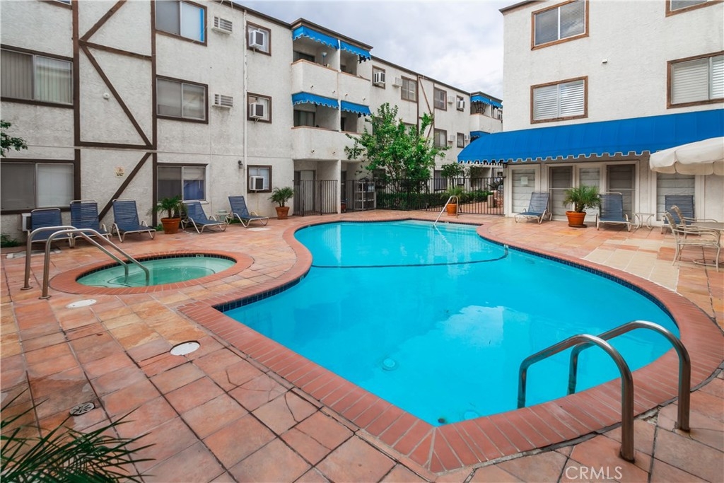 Top floor remodeled, 1 bedroom, 1 bath, Tarzana condo! 1-level with a balcony to enjoy morning coffee or dine al fresco. Smooth ceilings throughout. Living room with wood floors, recessed lighting, smooth ceilings, and crown molding. Remodeled kitchen with granite countertops, granite backsplash, shaker-style cabinets, (2 with glass inserts and 2 that are lazy Susan cabinets), stainless steel appliances, built-in wine rack, wood floor, under-counter lighting, recessed lighting and has several custom cabinets in front of the kitchen with glass doors and 2 hanging pendant lights. The microwave, gas range, and refrigerator are all included. All windows with shutters, including the sliding glass door. The dining area is open to the kitchen and the living room and has a great-looking contemporary hanging light fixture. The bedroom has a ceiling fan, glass and wood 2-door closet with interior closet lighting, crown molding, carpet floor, and recessed reading lights. The remodeled bath has a tiled tub/shower combo, tile countertop with a stylish glass sink, glass and tile backsplash, and a tile floor. There are 2 colorful glass wall sconces as well! The hallway linen cabinets are also shaker style. The double door closet in the living room and the bathroom door has also been replaced and are contemporary panel-style doors. There are 2 tandem parking spaces for this unit. The complex has a pool, spa, BBQs, and laundry facilities. Water and trash are paid for by the HOA. The building has elevators.