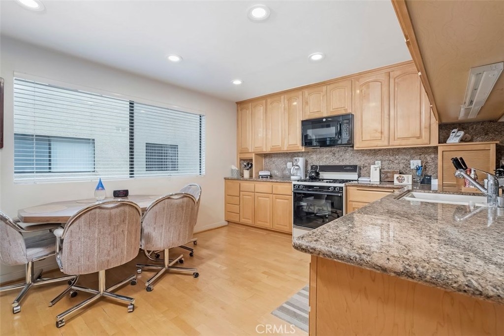 Welcome to this charming town home complex punctuated with beautiful landscaping offering roses, trees, flowers and greenery throughout. Enter the unit through the large private patio great for barbecues or to enjoy sitting outside. The living room has sliding glass doors with wood shutters opening to the patio. A gas fireplace punctuated with marble trim creates a lovely focus point.As you ascend the first level of stairs you are welcomed to the dining area with wide open views of the living room and the beautifully remodeled kitchen with manufactured wood flooring on the kitchen and dining room level.The two bedrooms up stairs each have large walk in closets and each has a private bathroom. There is a small balcony in one of the bedrooms and the other bedroom sports a Murphy bed between built in cabinets offering a desk and bookcase. a This large unit is in the middle of the complex providing a 1,657 square foot home and your own over-sized double garage that is attached and you enter your unit directly from the garage. Amenities include a recreation building with its own kitchen; sauna, jacuzzi, pool table. A large swimming pool offers fun plus added beauty to the grounds. Location is a big plus as the complex provides easy access to the 101 Fwy, the Orange Line, and shopping along Ventura Blvd. All of this for $499,000.
