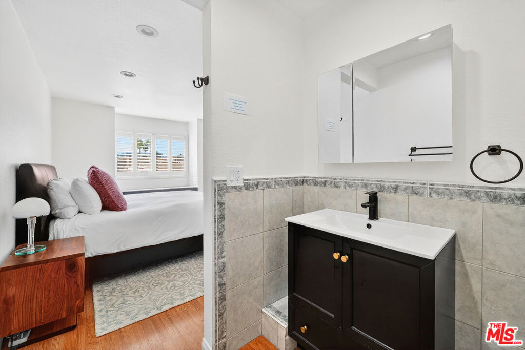 Discover modern comfort and style in this beautifully updated end-unit townhome in Tarzana's Villa North community. Featuring 3 beds and baths, this spacious residence spans approximately 1,516 sq. ft. of light-filled living space. This light-filled residence offers a split level open living space design with high ,recessed lighting, and a large private patio. The updated kitchen includes granite countertops and new GE appliances. Two bedrooms with private en-suite baths are located upstairs; the primary suite overlooks the lush central courtyard and includes a separate vanity area and a generous walk-in closet with custom shelving. Enjoy an oversize 2-car garage with direct access, side-by-side laundry, EV outlet (Tesla compatible), and recently upgraded electrical panel. With its pristine landscaping, Villa North offers gated entry, security cameras, pool, rec room, and low HOA with EQ insurance. Prime Tarzana location close to Ventura Blvd, dining, and freeway access. Turnkey and move-in ready.
