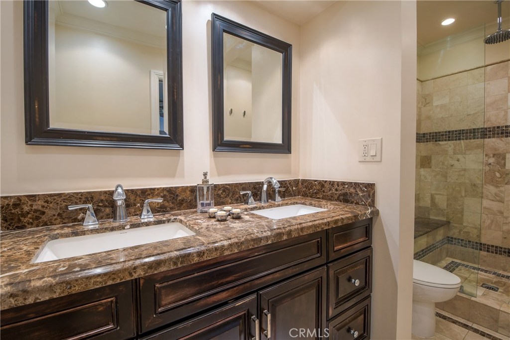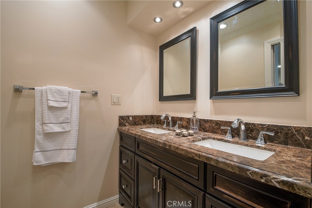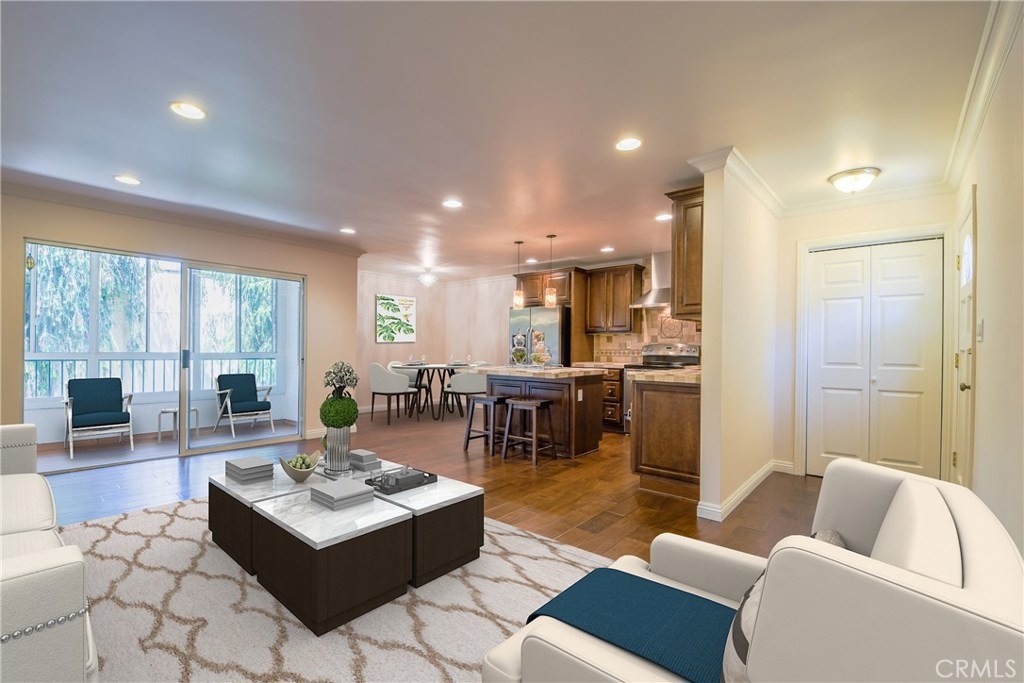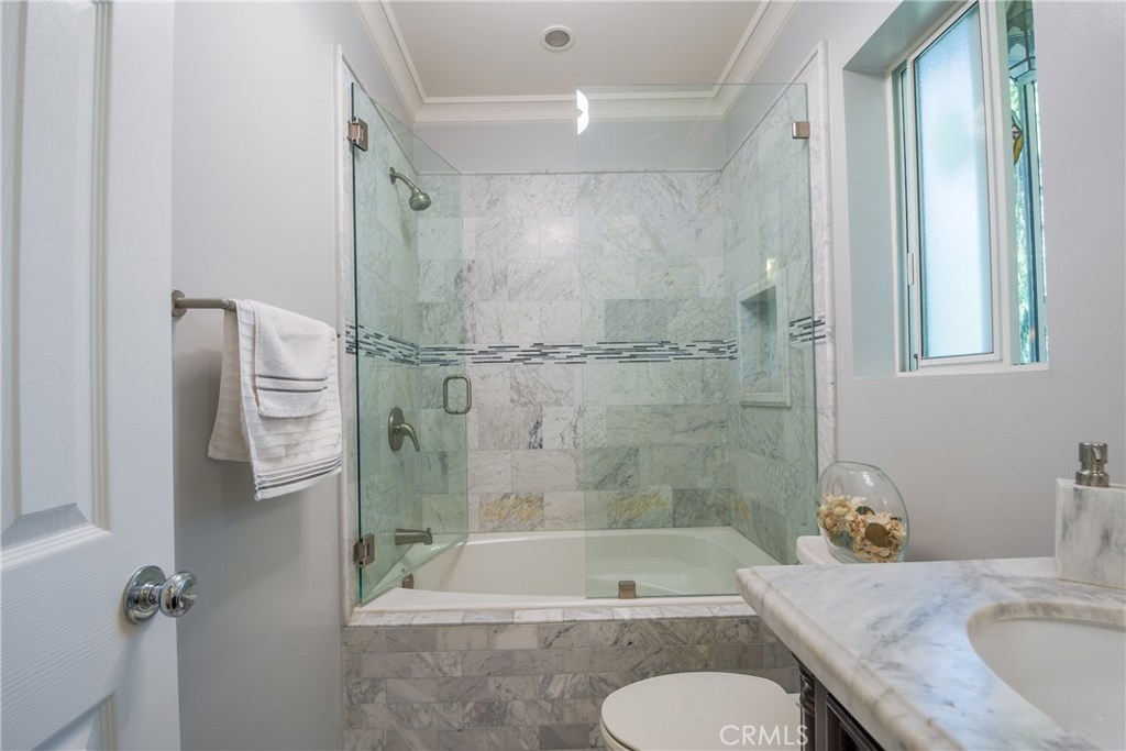 Stunning and immaculate 2 bed/2 bath top-floor condominium in highly desirable and securely gated Villa Lorena in Tarzana. An impeccably updated interior courtyard unit with open floor plan and private enclosed balcony. Elegant yet functional kitchen includes island with barstool seating, ample storage, and stainless steel appliances. Opens into spacious living room and dining room. Marble bathrooms with glass shower doors. Double-sink master bath includes a large shower with marble bench and rainfall/hand-held shower heads. Villa Lorena is desirably located near the 101 FWY with convenient walkability to nearby stores, restaurants, schools, places of worship, major medical center, and Metro Orange Line. The community includes a recreation room, pool, two spas, laundry rooms, and green belts. The unit includes two tandem parking spaces (one covered) that are accessed through a secure gate.
