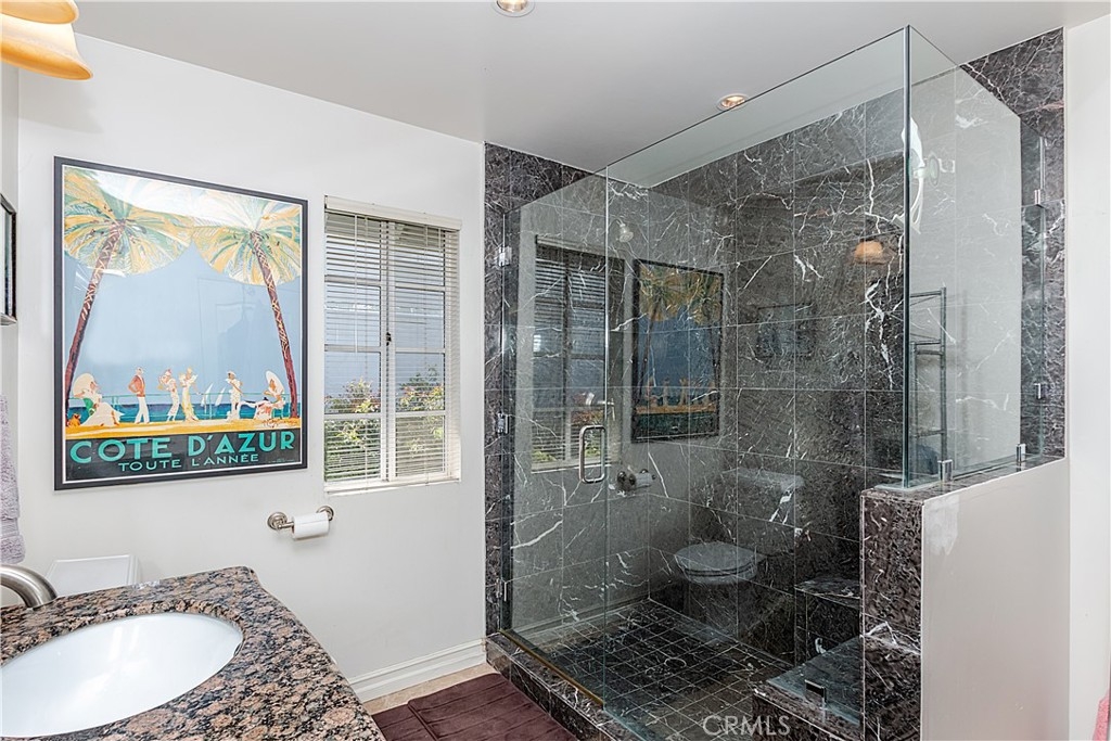 This small gated community of only 24 units - Windemere may be The Most Expansive High End Tarzana Townhome. Enjoy the open feel of the main level that offers marble tile floors in an open concept dining and living room areas. Gourmet kitchen with center island, stainless steel appliances, breakfast area and granite counter tops is open to den and both have travertine floors. All cabinets have pull outs for your convenience. Main level also has an oversized powder room, fireplace, custom moldings recessed lights and bar area with sink. Upper level has wood flooring through out the bedrooms and tiled baths. With over 2300sf of comfort and beauty this home has it all: oversized 2 car garage with huge pantry/storage room and direct access to your kitchen, laundry chute from the second level to the garage where the washer and dryer are located and a dumb waiter to carry your parcels directly from the garage to the kitchen. Don't miss on this resort like living beauty.