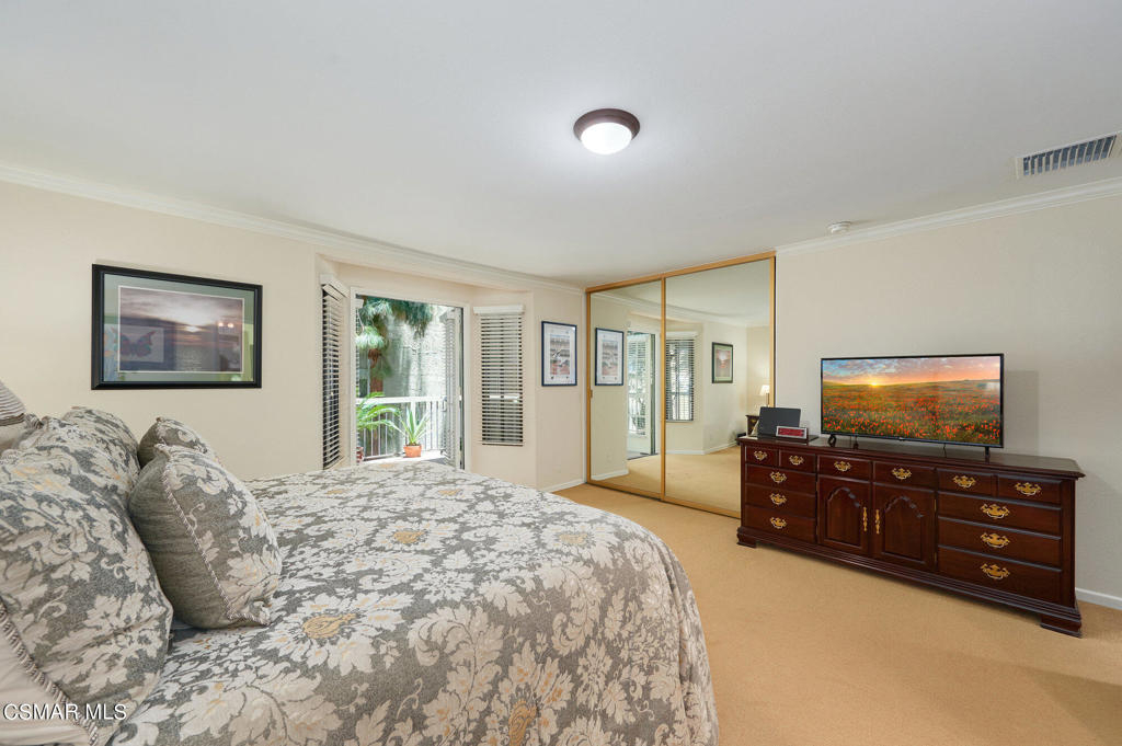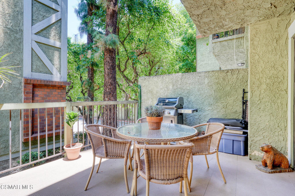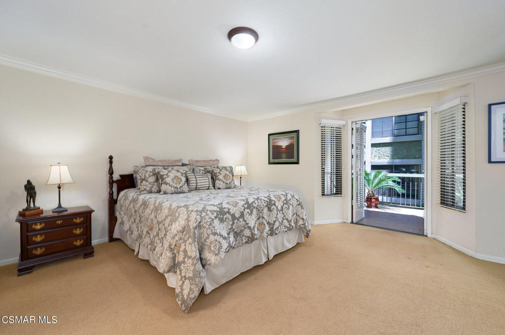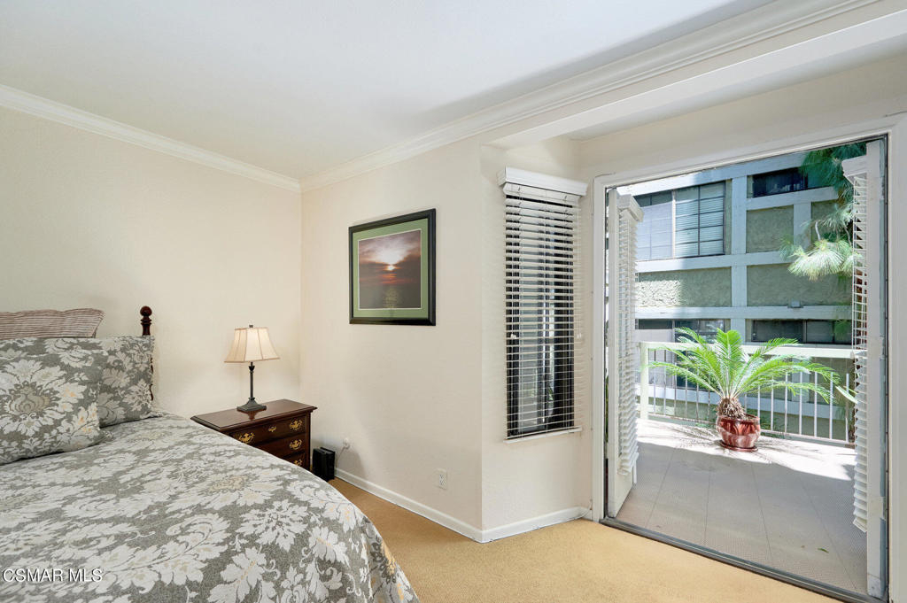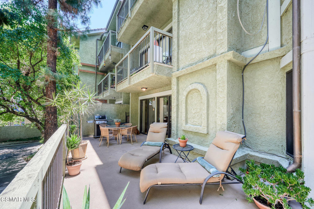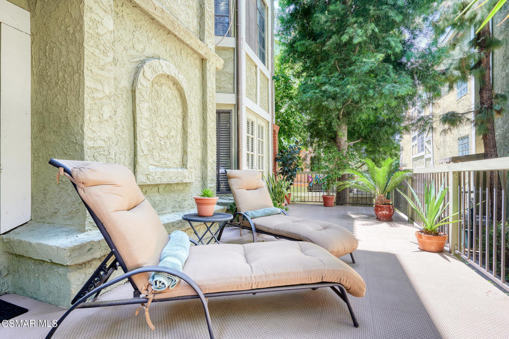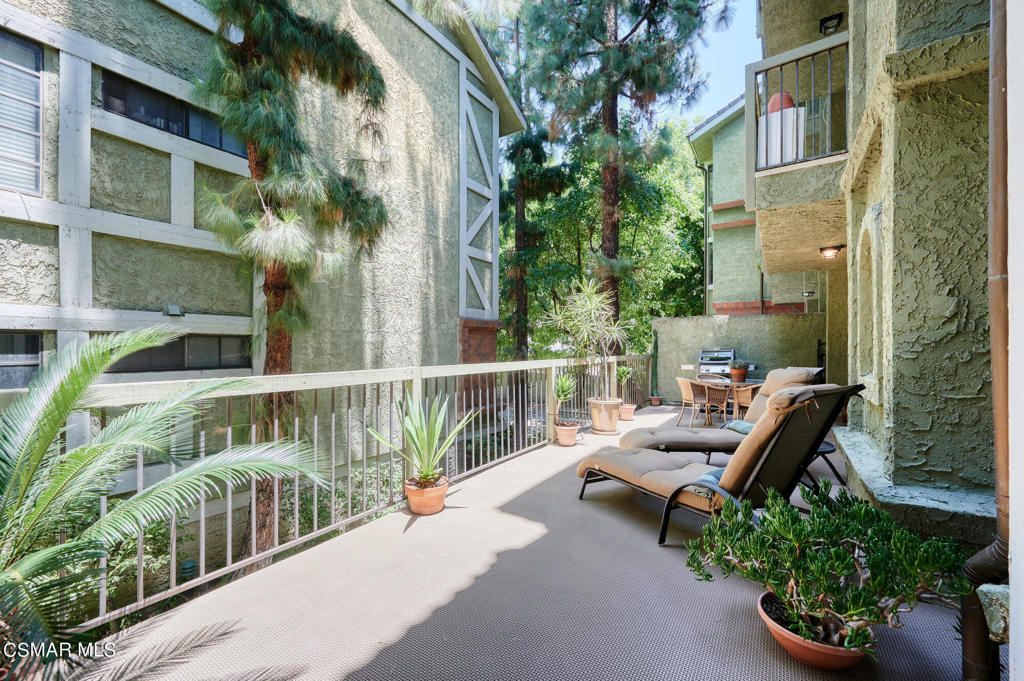 Welcome to this upgraded meticulously maintained very spacious single story 2 bed and 2 bath home with a rare to the complex oversized (approx. 300 sq ft) balcony which is perfect for relaxing or entertaining. Enter this home that leads to large living area with charming fireplace, wet bar, crown molding, recessed lighting, and a large slider that leads to the balcony. This distinctive home offers an open floor plan where the kitchen opens to a large dining area and the living area. The gourmet kitchen was remodeled with beautiful custom cabinetry, granite countertops, a center island with seating and storage, stainless steel appliances and sink and tile flooring. The primary bedroom offers lovely Bay French Doors that lead to the balcony as well. The bathroom was remodeled with custom marble countertop vanity, dual sinks, and a linen closet. The Hall bathroom was also remodeled with stall shower and custom marble top vanity. Second bedroom offers a nice sized walk-in closet. The laundry area and unit are in the home and it has ample storage too! The HVAC system was replaced in 2018 another great update this home offers. The location and position of this unit allows for cooler summers with potentially lower utility bills. l The Regent Court community offers newer custom security doors, underground parking, and has a nice pool and spa. It is conveniently located in a desirable area of Tarzana offering serenity at home, and is also close to restaurants, Ventura Blvd. shopping, and state of the art medical facilities. Take advantage of this opportunity to move right in and enjoy!