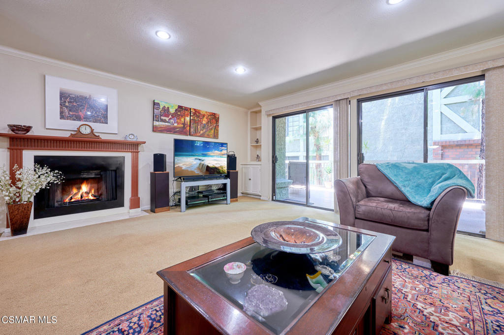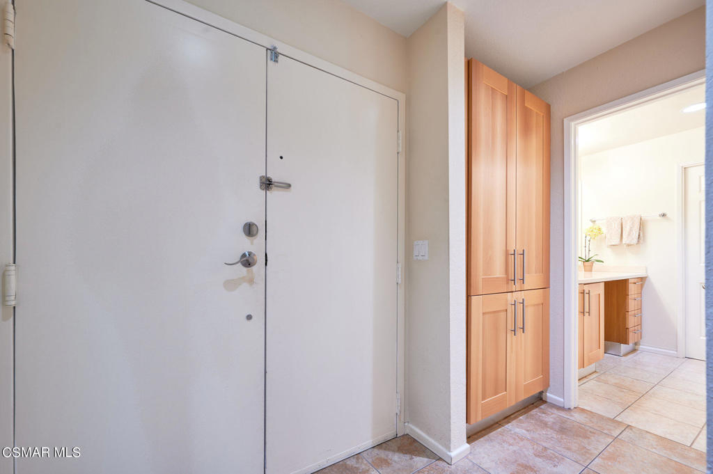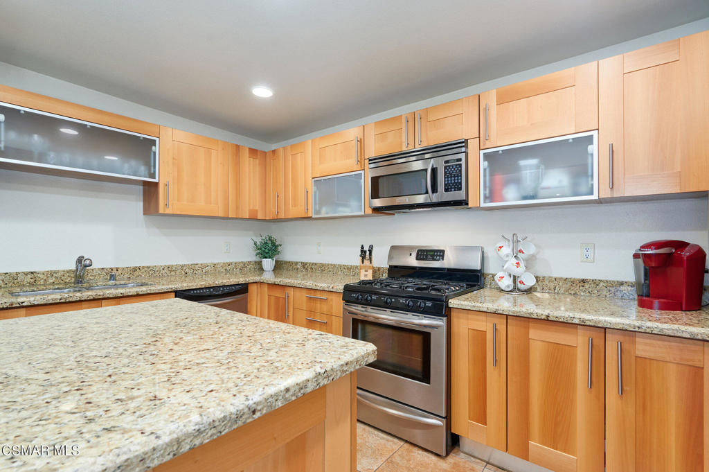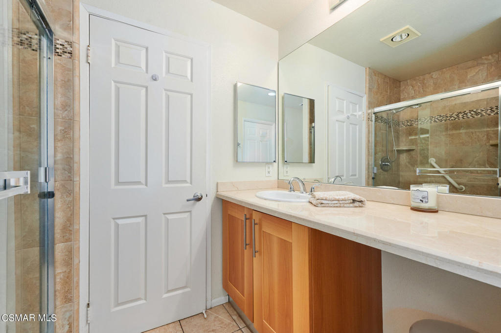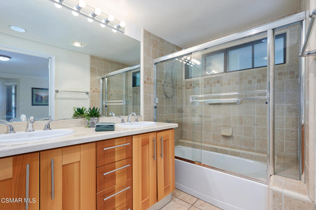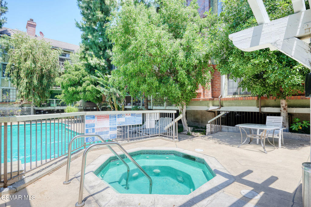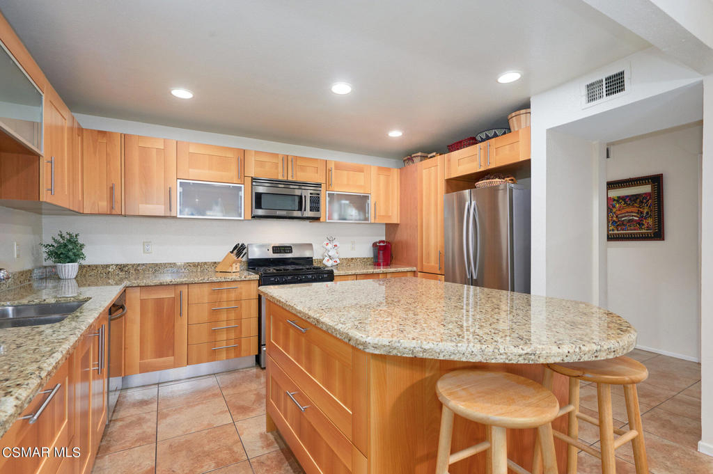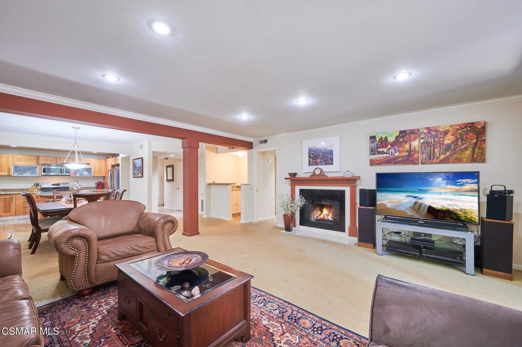 Welcome to this upgraded meticulously maintained very spacious single story 2 bed and 2 bath home with a rare to the complex oversized (approx. 300 sq ft) balcony which is perfect for relaxing or entertaining. Enter this home that leads to large living area with charming fireplace, wet bar, crown molding, recessed lighting, and a large slider that leads to the balcony. This distinctive home offers an open floor plan where the kitchen opens to a large dining area and the living area. The gourmet kitchen was remodeled with beautiful custom cabinetry, granite countertops, a center island with seating and storage, stainless steel appliances and sink and tile flooring. The primary bedroom offers lovely Bay French Doors that lead to the balcony as well. The bathroom was remodeled with custom marble countertop vanity, dual sinks, and a linen closet. The Hall bathroom was also remodeled with stall shower and custom marble top vanity. Second bedroom offers a nice sized walk-in closet. The laundry area and unit are in the home and it has ample storage too! The HVAC system was replaced in 2018 another great update this home offers. The location and position of this unit allows for cooler summers with potentially lower utility bills. l The Regent Court community offers newer custom security doors, underground parking, and has a nice pool and spa. It is conveniently located in a desirable area of Tarzana offering serenity at home, and is also close to restaurants, Ventura Blvd. shopping, and state of the art medical facilities. Take advantage of this opportunity to move right in and enjoy!