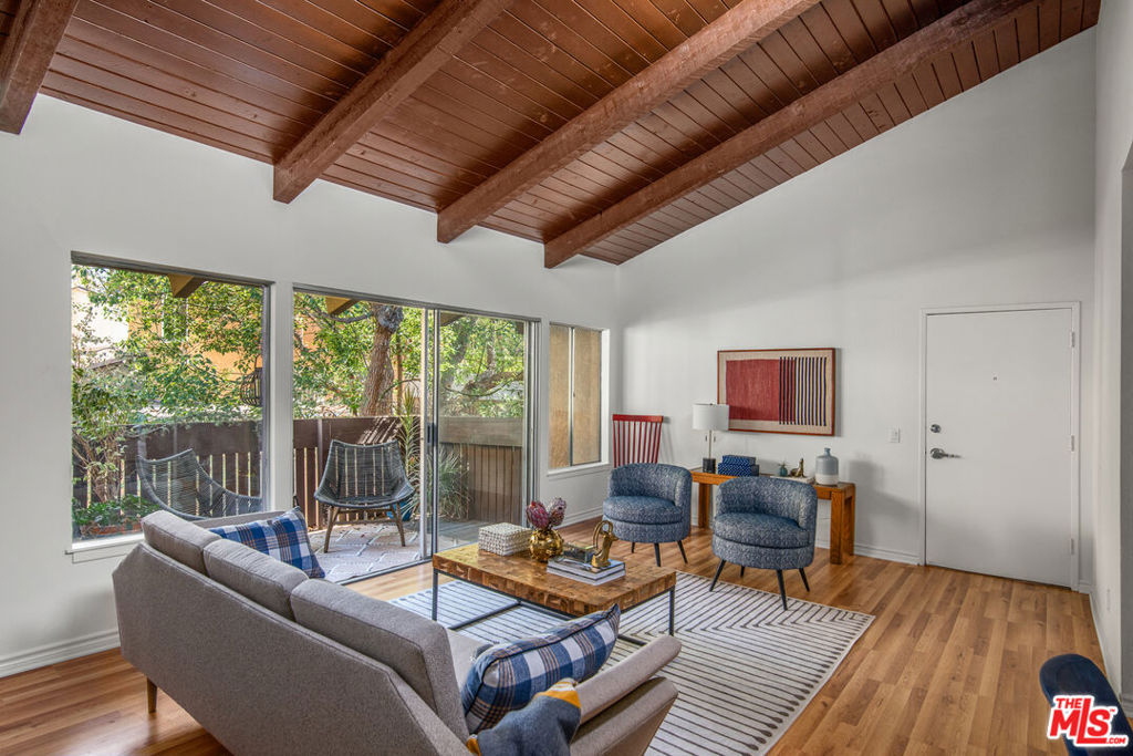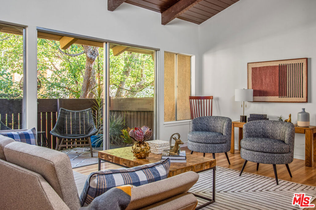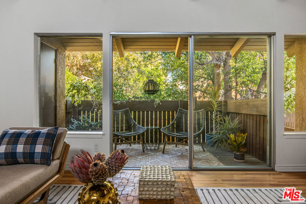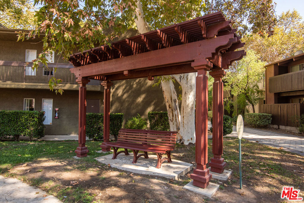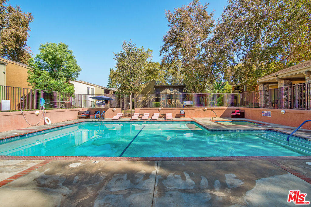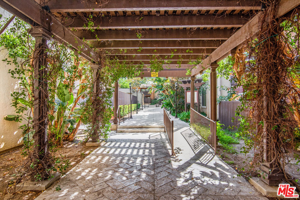 Located in the heart of Tarzana, close to Ventura Blvd & its eclectic offering of shops & restaurants, sits this beautiful condo in a gated complex. A vine covered trellis & towering California sycamores lead to the second-floor unit. Once inside, open beam ceilings, glass slider & clerestory window allow light to pour in from every angle. Hardwood floors dance across a blended dining & living room, opening to a balcony overlooking a symphony of verdant beauty. Just beyond, a remodeled kitchen comes replete w/modern cabinetry, stone counters & stainless-steel appliances. Two bedrooms + 2 updated baths, includes a light-filled ensuite w/mirrored closet sliders & walk-in shower, whilst inside laundry adds convenience. Amenities include gated access, heated pool + spa, BBQ area & meandering paths under canopies of trees. Central HVAC & 2 parking spaces complete this immaculate offering.