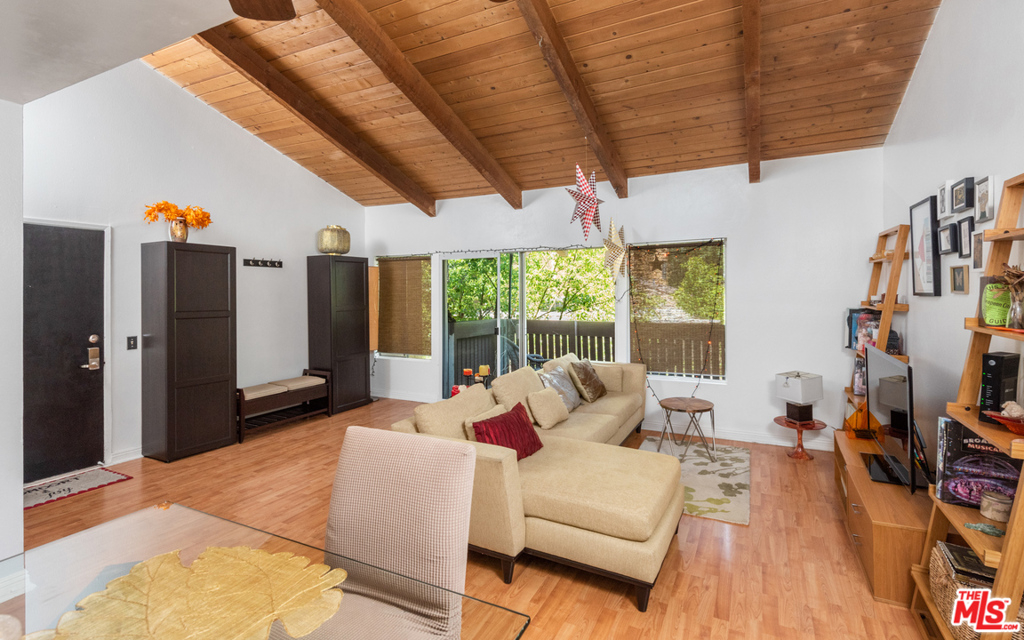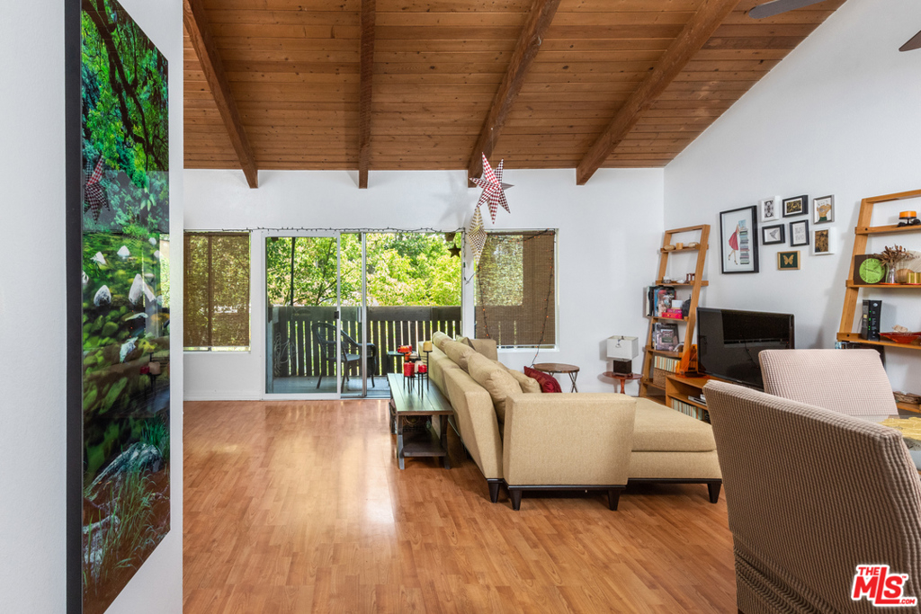 Beautiful light and bright 2bd/2baths 870sf condo in the heart of Tarzana with soaring high vaulted wood beamed ceilings. This top floor, 2nd story unit offers wood flooring thruout with new wood floors in the bedrooms, great kitchen with newer stainless steal appliances, lots of windows all around and tons of closet/storage space. The association offers a huge swimmers pool with separate kids pool, playground, huge gym, BBQ area and recreation room. Wont last!