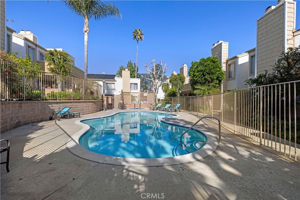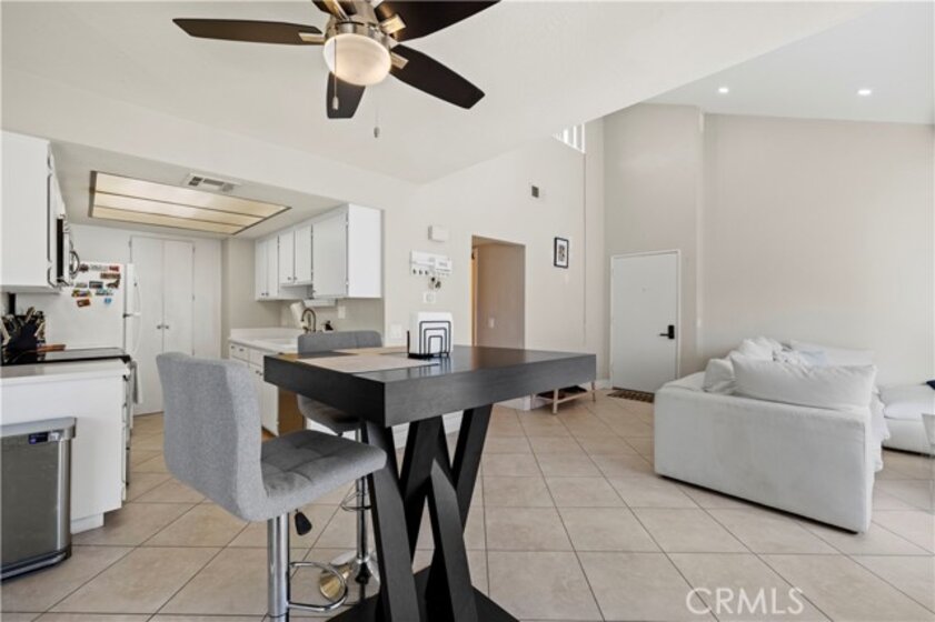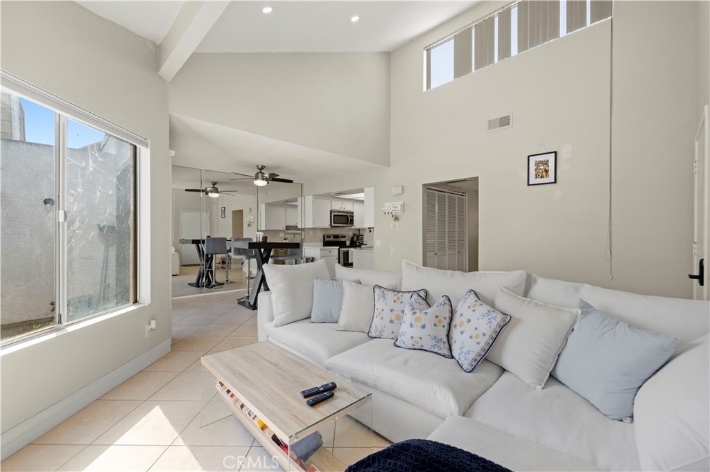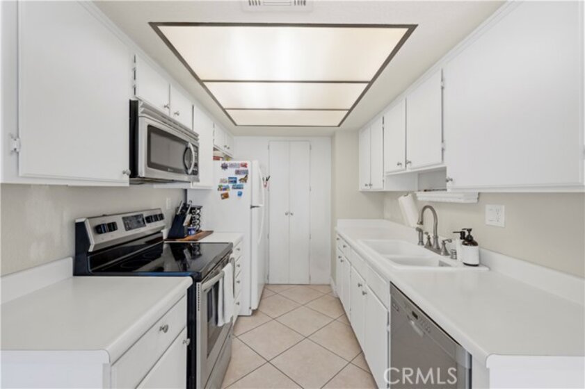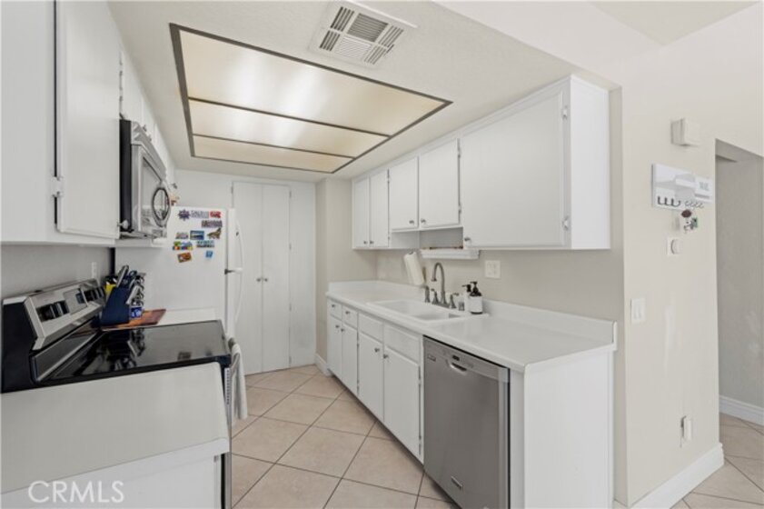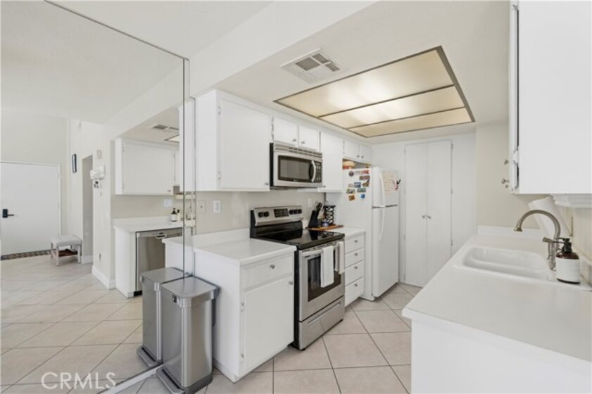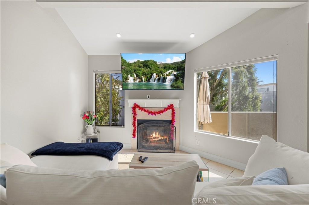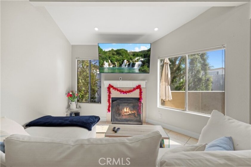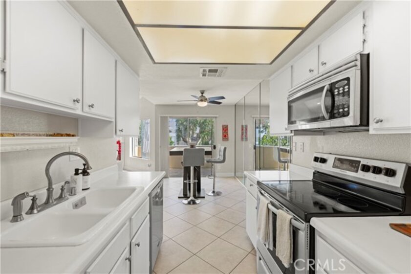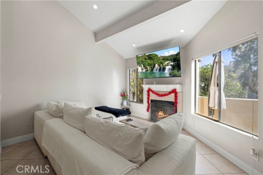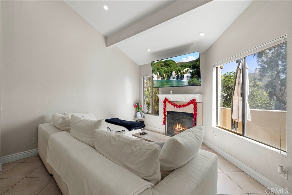 This beautiful upper-level condo is located in one of Tarzana’s most sought-after gated communities, Tarzana Woods, surrounded by lush landscaping, colorful flower beds, and mature shade trees that create exceptional curb appeal. Step inside to a bright and open floor plan offering approximately 866 square feet of comfortable living space. The spacious living room is filled with natural light and features soaring beamed ceilings, recessed lighting, elegant tiled electric fireplace with mantel, and 18"X18" diagonally laid porcelain tile flooring throughout the main living areas. The open kitchen is light and welcoming, showcasing white cabinetry that extends to the ceiling, laminate countertops, a dual-basin sink, stainless steel appliances—including an electric range, built-in microwave, and dishwasher—a convenient pantry, and easy-care tile floors. Adjacent to the kitchen, the dining area features a lighted ceiling fan, mirrored walls, and direct access to the private balcony, making it ideal for both everyday meals and entertaining. This home offers two generously sized bedrooms and one well-appointed bathroom. The primary bedroom includes a large picture window with honeycomb shades, dual closets—with mirrored wardrobe doors—and plush wall-to-wall carpeting. The second bedroom also features a large window, honeycomb shades, ample closet space with mirrored doors, and wall-to-wall carpeting. The bathroom is tastefully designed with a white vanity, integrated basin, large dressing mirror, designer lighting, tub/shower combination, and porcelain tile flooring. The hallway provides additional storage with a coat closet and abundant linen cabinets. A convenient indoor laundry area with extra storage adds to the home’s functionality. Enjoy quiet mornings or evening dining on your private balcony, perfect for relaxing outdoors. Additional highlights include a NEWER HVAC system, a sparkling community pool and spa, and a gated two-car tandem covered carport with built-in storage, plus ample guest parking. Ideally located near shopping, dining, excellent schools, the 101 Freeway, and public transportation, this home offers comfort, convenience, and resort-style living in a prime Tarzana location.
