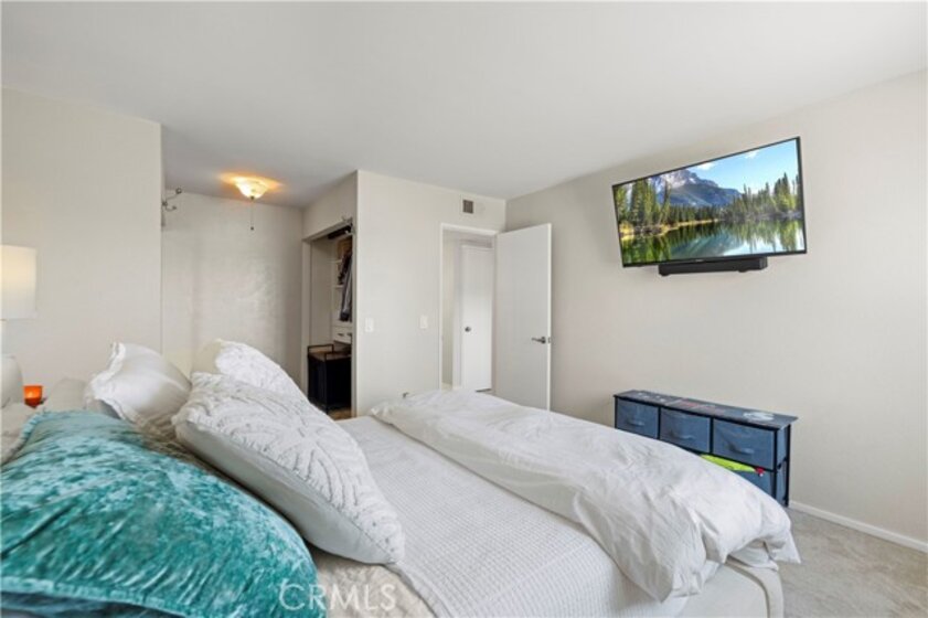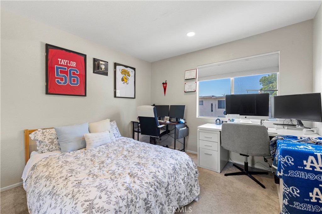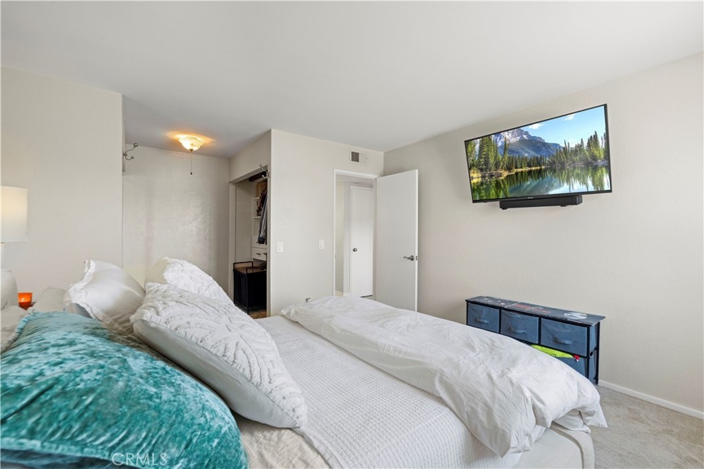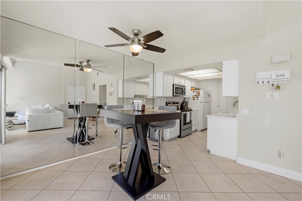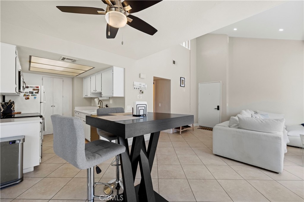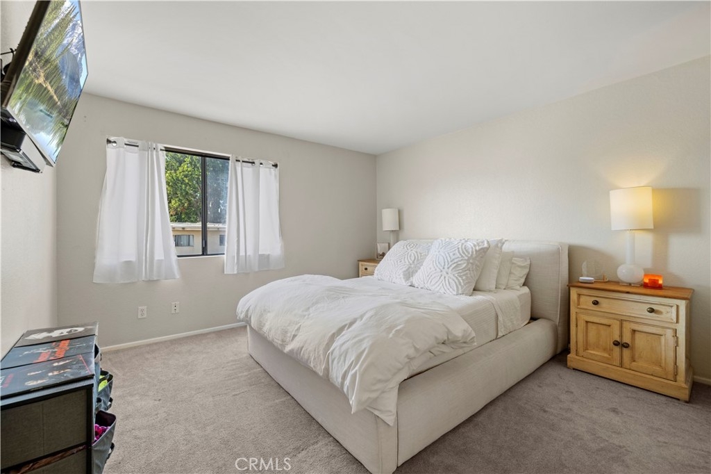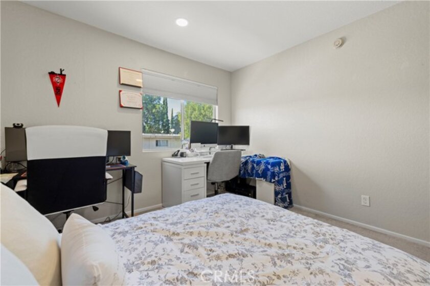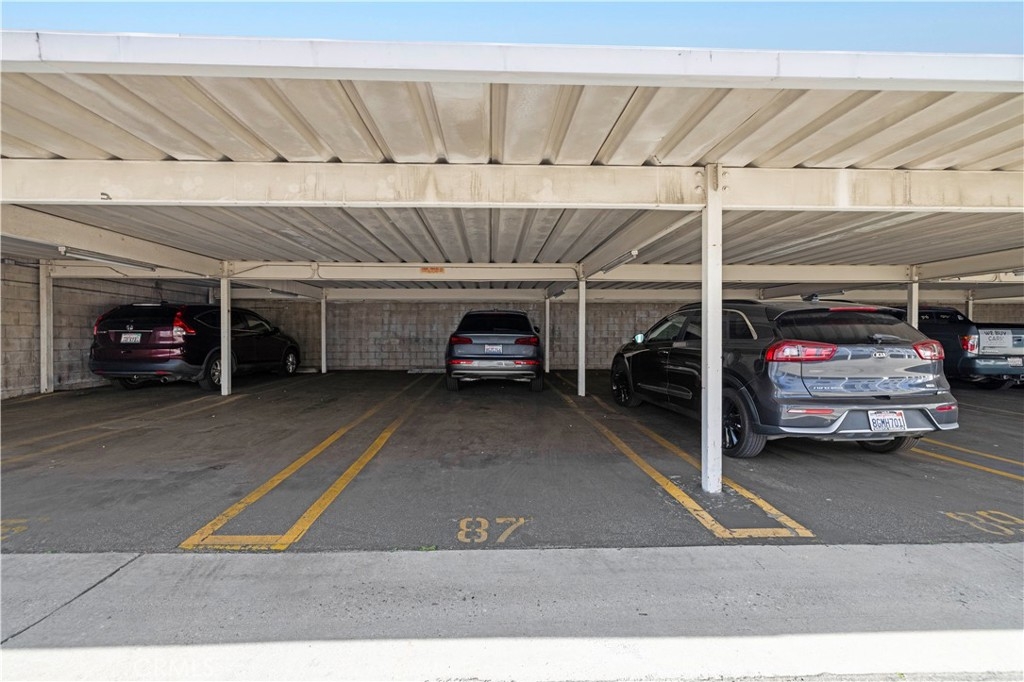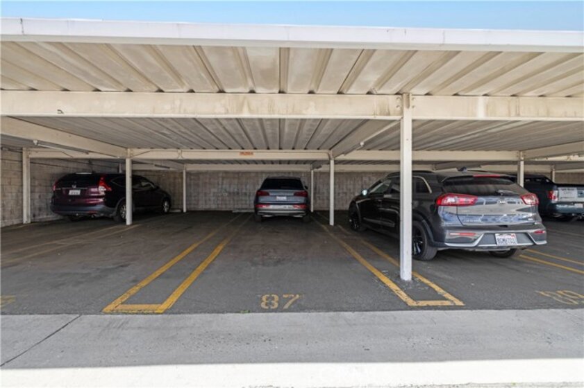 This beautiful upper-level condo is located in one of Tarzana’s most sought-after gated communities, Tarzana Woods, surrounded by lush landscaping, colorful flower beds, and mature shade trees that create exceptional curb appeal. Step inside to a bright and open floor plan offering approximately 866 square feet of comfortable living space. The spacious living room is filled with natural light and features soaring beamed ceilings, recessed lighting, elegant tiled electric fireplace with mantel, and 18"X18" diagonally laid porcelain tile flooring throughout the main living areas. The open kitchen is light and welcoming, showcasing white cabinetry that extends to the ceiling, laminate countertops, a dual-basin sink, stainless steel appliances—including an electric range, built-in microwave, and dishwasher—a convenient pantry, and easy-care tile floors. Adjacent to the kitchen, the dining area features a lighted ceiling fan, mirrored walls, and direct access to the private balcony, making it ideal for both everyday meals and entertaining. This home offers two generously sized bedrooms and one well-appointed bathroom. The primary bedroom includes a large picture window with honeycomb shades, dual closets—with mirrored wardrobe doors—and plush wall-to-wall carpeting. The second bedroom also features a large window, honeycomb shades, ample closet space with mirrored doors, and wall-to-wall carpeting. The bathroom is tastefully designed with a white vanity, integrated basin, large dressing mirror, designer lighting, tub/shower combination, and porcelain tile flooring. The hallway provides additional storage with a coat closet and abundant linen cabinets. A convenient indoor laundry area with extra storage adds to the home’s functionality. Enjoy quiet mornings or evening dining on your private balcony, perfect for relaxing outdoors. Additional highlights include a NEWER HVAC system, a sparkling community pool and spa, and a gated two-car tandem covered carport with built-in storage, plus ample guest parking. Ideally located near shopping, dining, excellent schools, the 101 Freeway, and public transportation, this home offers comfort, convenience, and resort-style living in a prime Tarzana location.