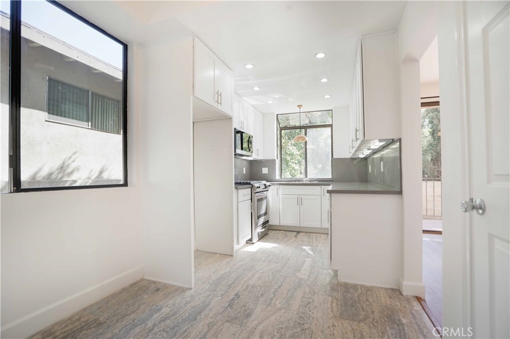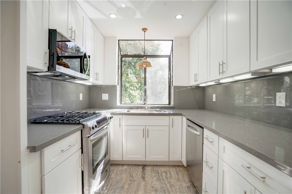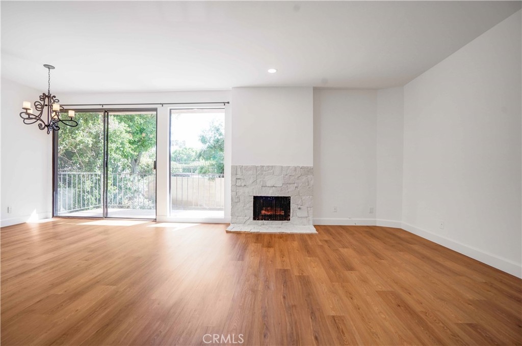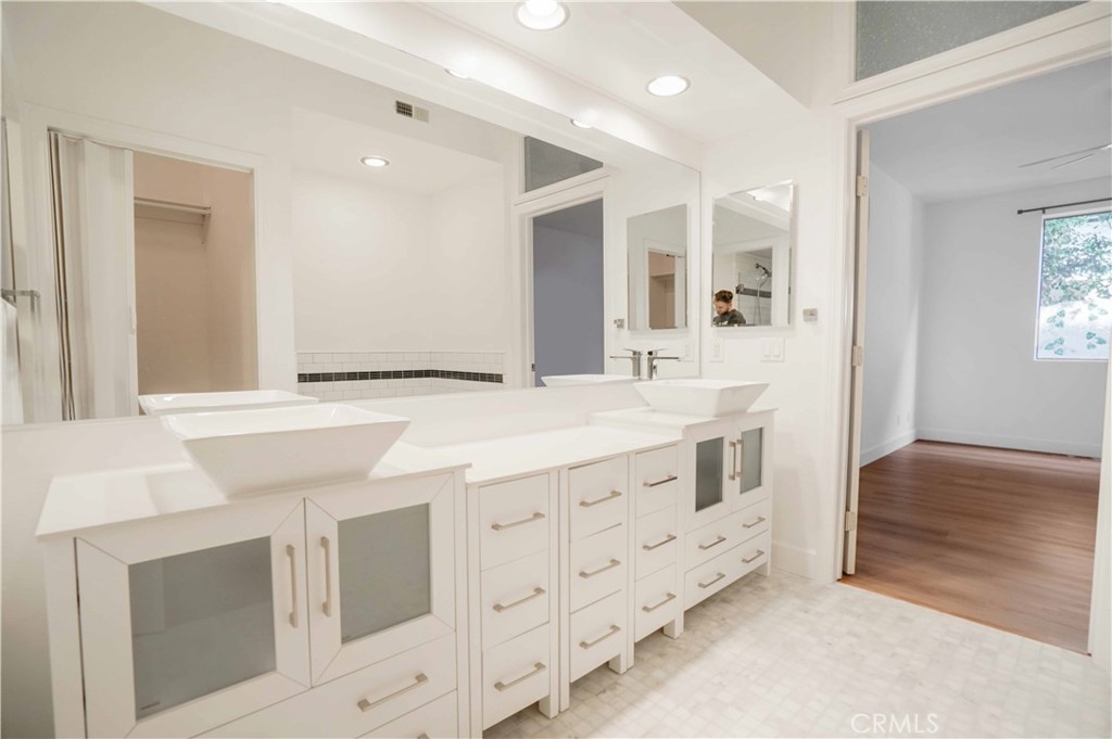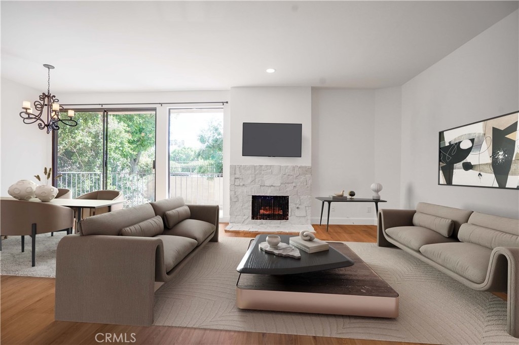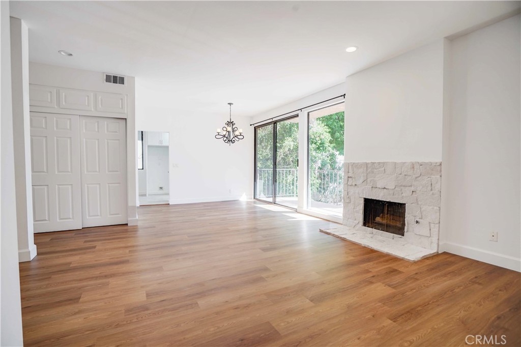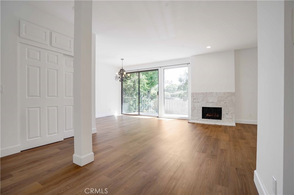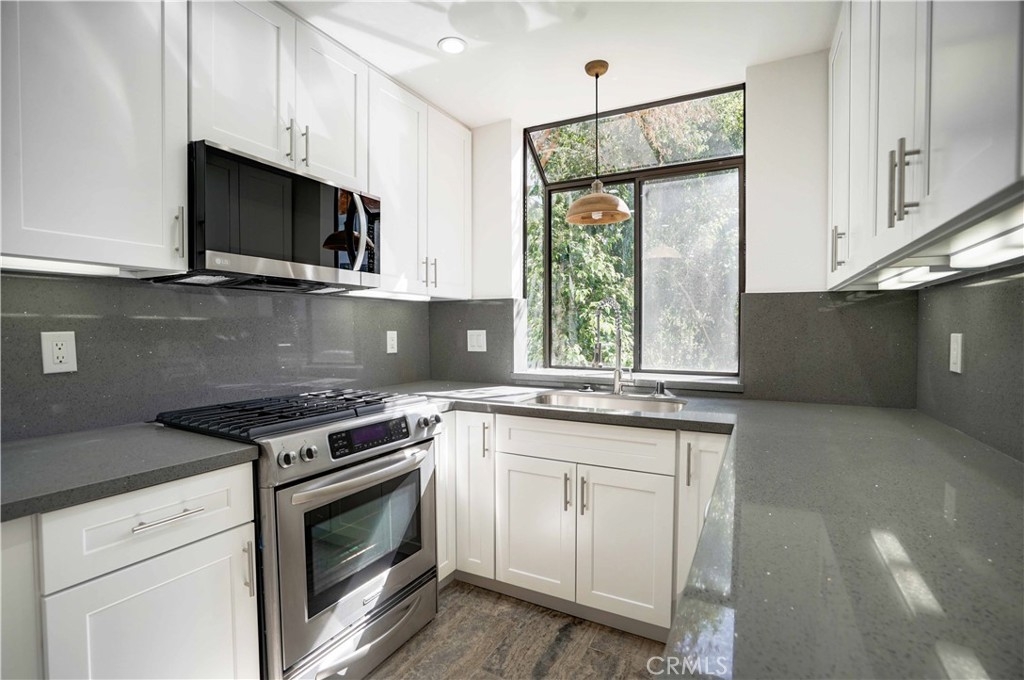 This gleaming newly updated single story condo is set above the ground level in sought after Tarzana in a great location is ready to move into. Features include luxury scratch-resistant engineered wood- like flooring that runs throughout the freshly painted interior with smooth high ceilings, recessed lights, raised panel doors, & upgraded light switches. As you enter the bright living room your eye is drawn to the patio balcony and view beyond accessed through large sliding doors which serve the living room and formal dining area. A newly refaced limestone fireplace warms these main living areas. The dine in kitchen features new white cabinetry with self-closing hinges, gray quartz counters, stainless steel Kitchenaid 4 burner gas stove with upper microwave and exhaust fan, kitchenaid dishwasher, stainless steel farm sink with pot filler faucet, garden window, & a large laundry room with upper cabinets. Down the wide hall to the main bathroom with a tub/shower combo, & new white vanity with engineered marble countertop. Adjacent to that is a secondary bedroom that faces east w/lg window & mirrored closet. The ensuite primary bedroom also faces east and has a spa-like attached bathroom complete with walk in closet w/ built ins, a tub, separate walk in shower w/glass doors + a bench seat & new white vanity cabinets w/dbl. raised modern sinks & engineered marble countertop. This is a security complex w/18 units, locked main door entrance, gated parking with two tandem spots, apx. 4 guest spaces, storage, community room, & central courtyard. All the great shopping is within walking distance!