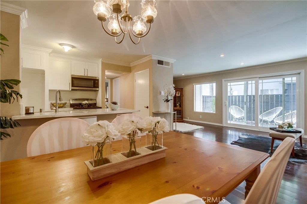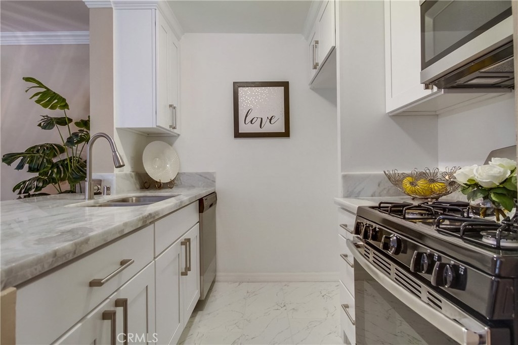 Beautifully updated, two-bedroom, one-and-one-quarter bathroom, first floor residence in Tarzana's highly sought-after resort style complex California Place. New kitchen cabinets, marble countertops, stainless steel appliances, newer heating and air conditioning and wood flooring. It's primely located in front of the lush greenery that surrounds one of the many waterfall creeks in the complex. The recreation center has a pool table, dry sauna, gym, heated pool, spa and barbecue pits. Earthquake insurance included in Homeowners Association dues, plus additional storage located in the large balcony.