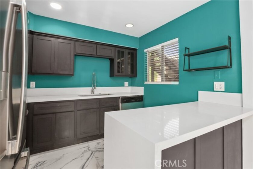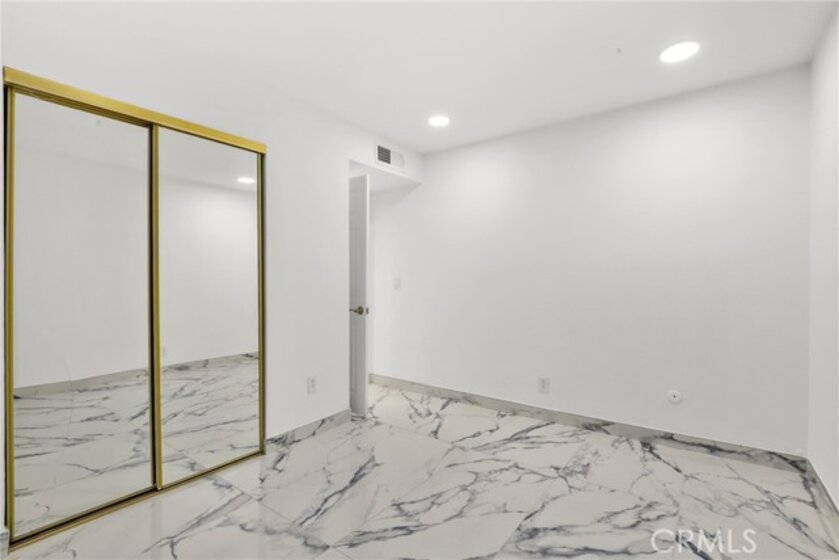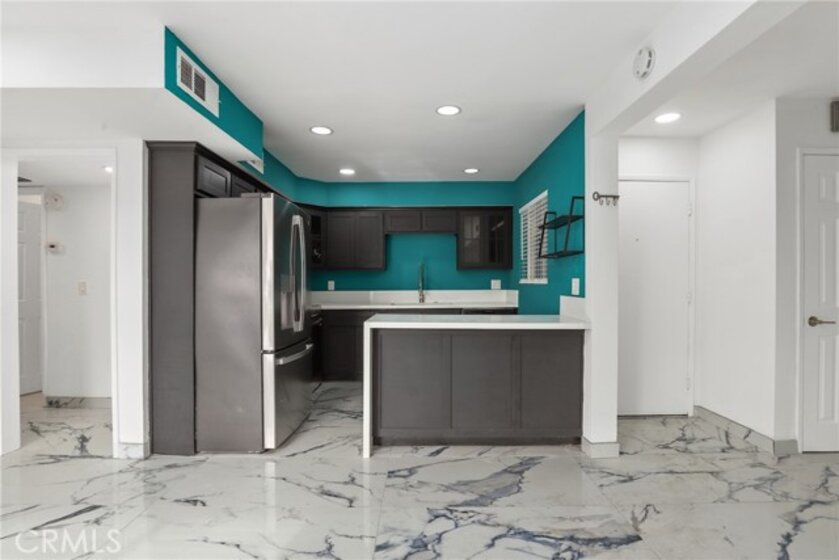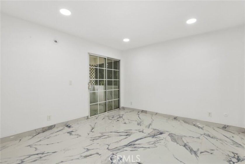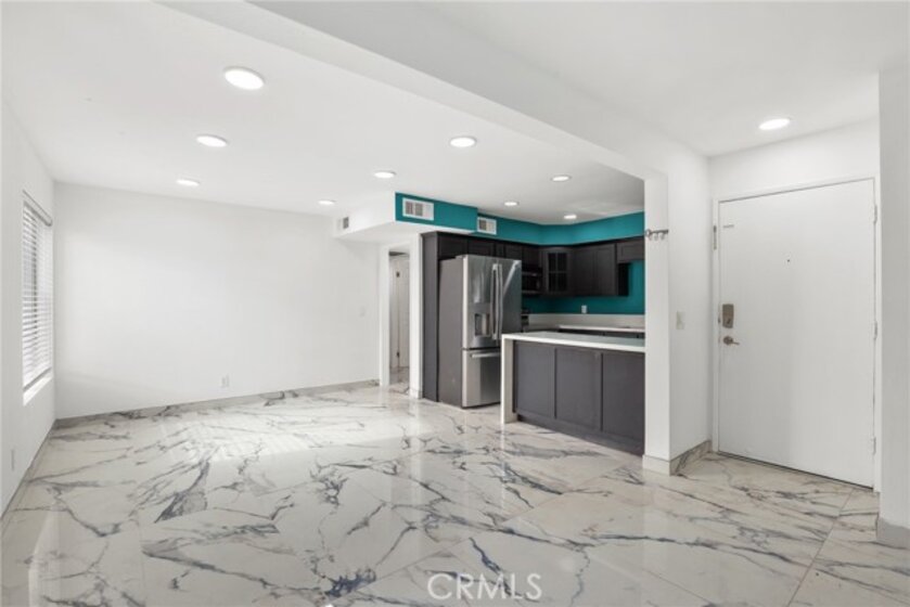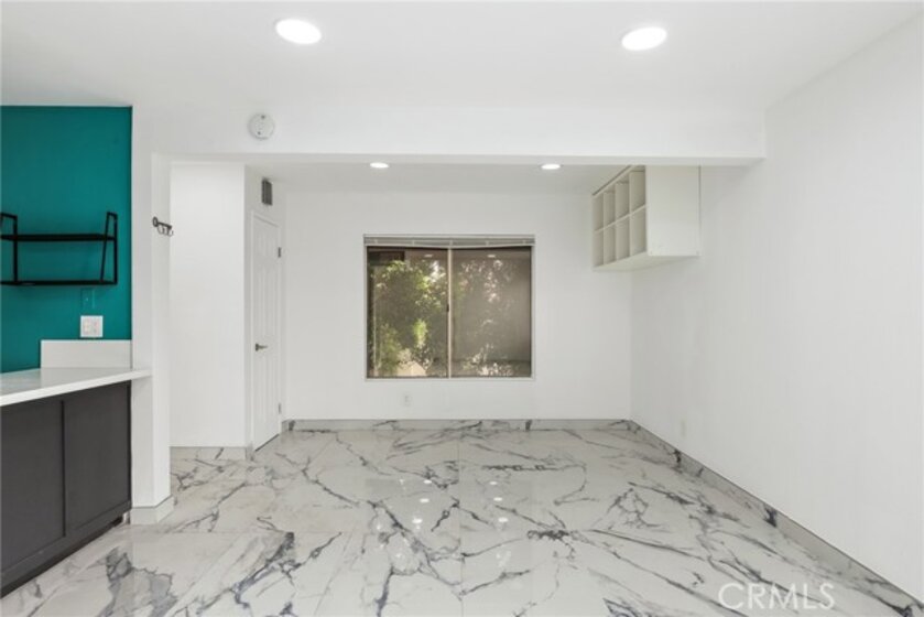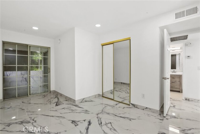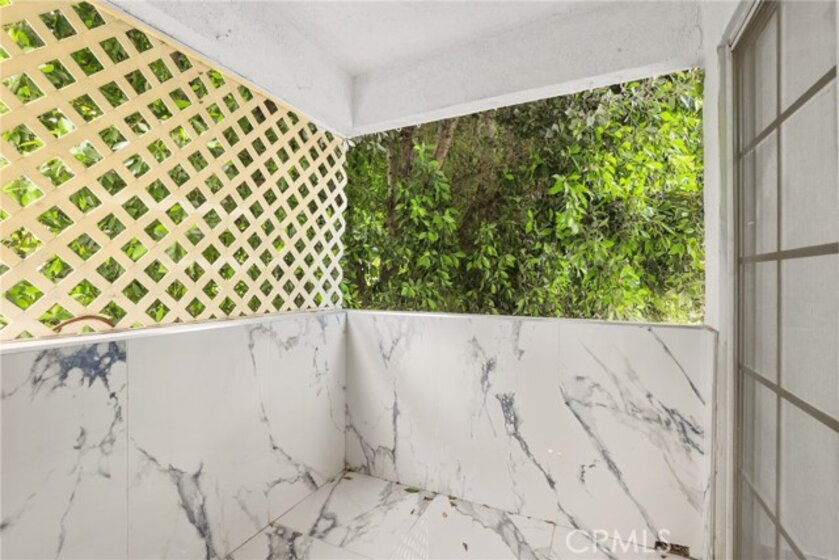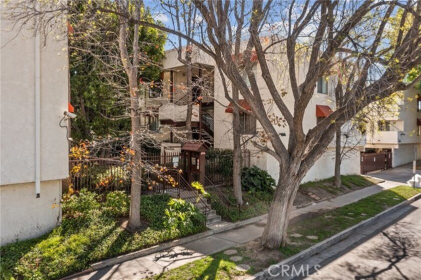Welcome to The Rose Bud, a charming 36-unit complex with lush landscaping, a gated entry, and a sparkling swimming pool! This 2 BR/1 BA condo has been remodeled to a chic, modern aesthetic with Brazilian porcelain tile flooring throughout and an open-concept living, dining, and kitchen. The kitchen has elegant dark cabinetry; stainless steel appliances, an appealing "waterfall-style" white stone breakfast bar; and stone countertops. Each well-sized bedroom has direct access to the private, covered balcony. The impressive bathroom has a large step-in, tile, and glass shower. This end unit has only one adjoining wall, central AC and heating, and a tandem, 2-car parking space. The HOA includes access to the pool and BBQ area, nearby community laundry, water/sewer/trash, common area maintenance, controlled access entry with video surveillance, gated parking, and exterior insurance. This unit is mere steps from the pool, community laundry, and parking!) Walkable to Ventura Blvd, Nordstrom Rack and Trader Joes.