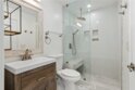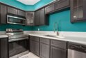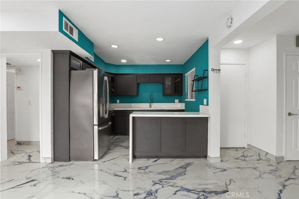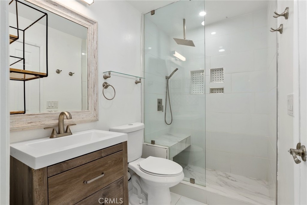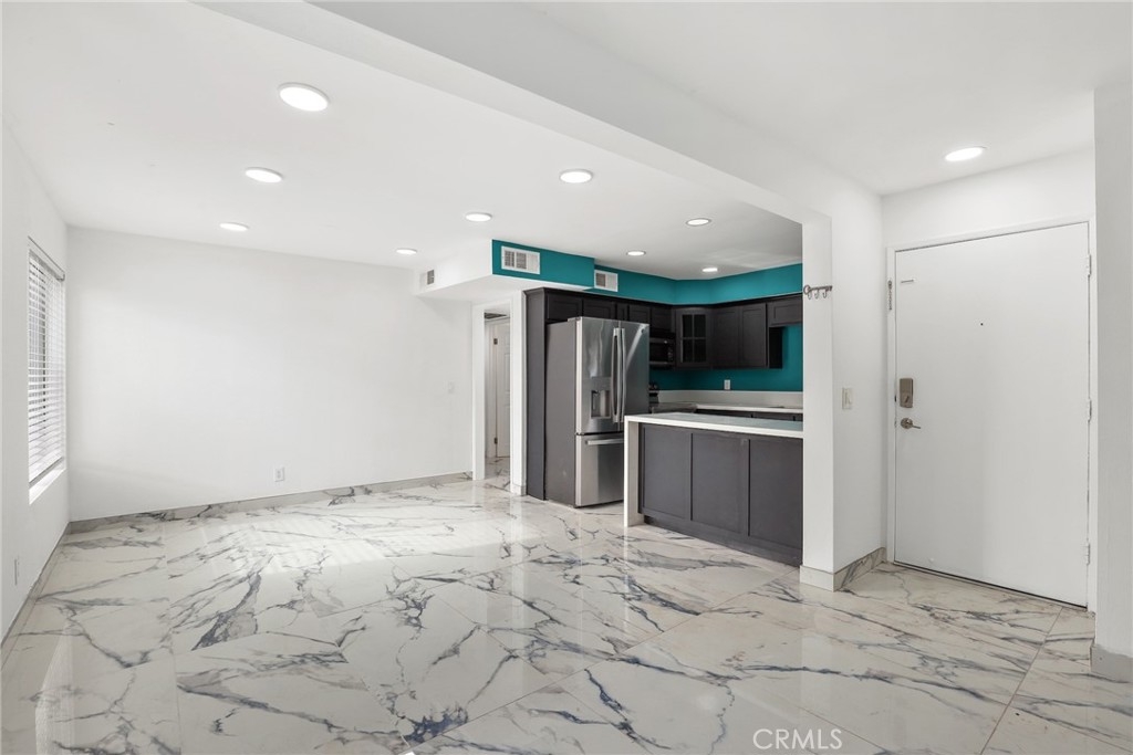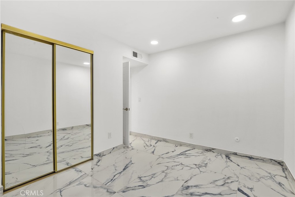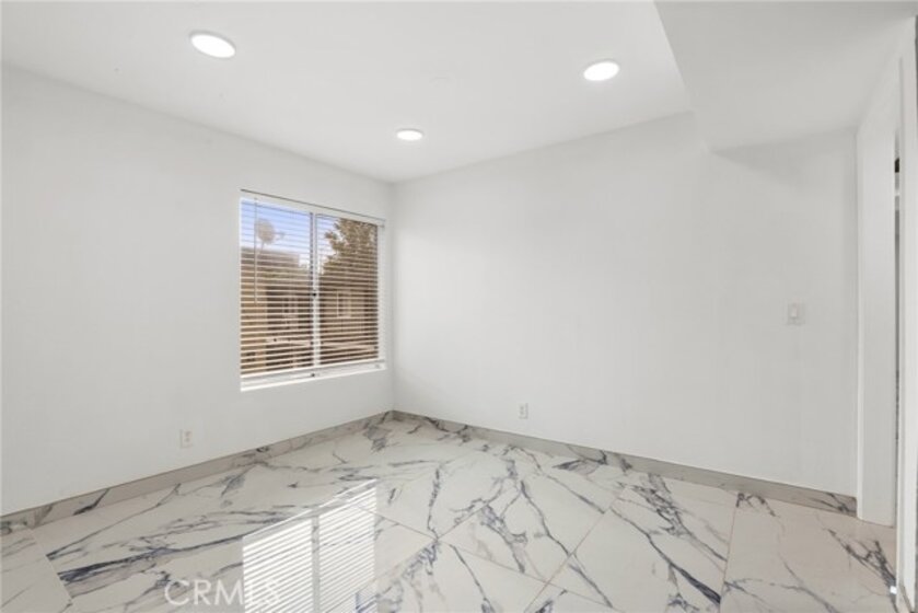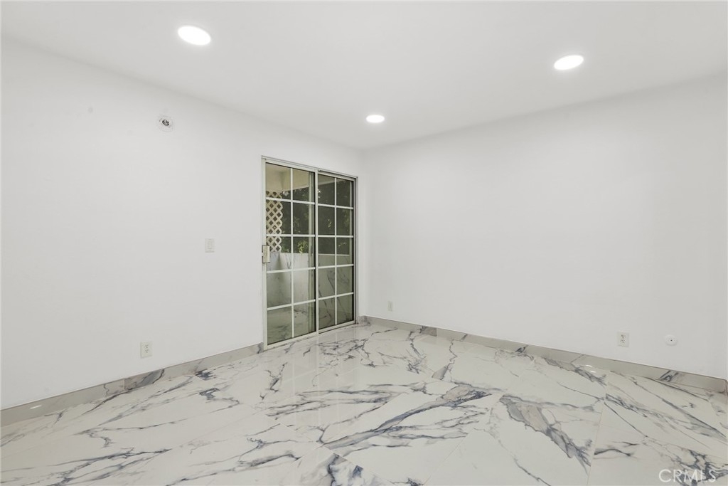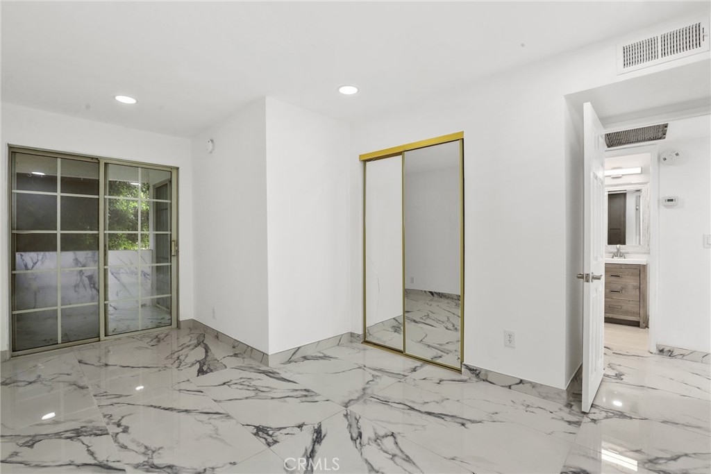 Welcome to The Rose Bud, a charming 36-unit complex with lush landscaping, a gated entry, and a sparkling swimming pool! This 2 BR/1 BA condo has been remodeled to a chic, modern aesthetic with Brazilian porcelain tile flooring throughout and an open-concept living, dining, and kitchen. The kitchen has elegant dark cabinetry; stainless steel appliances, an appealing "waterfall-style" white stone breakfast bar; and stone countertops. Each well-sized bedroom has direct access to the private, covered balcony. The impressive bathroom has a large step-in, tile, and glass shower. This end unit has only one adjoining wall, central AC and heating, and a tandem, 2-car parking space. The HOA includes access to the pool and BBQ area, nearby community laundry, water/sewer/trash, common area maintenance, controlled access entry with video surveillance, gated parking, and exterior insurance. This unit is mere steps from the pool, community laundry, and parking!) Walkable to Ventura Blvd, Nordstrom Rack and Trader Joes.