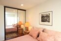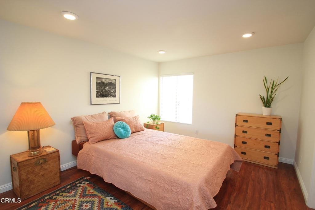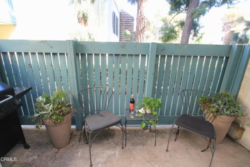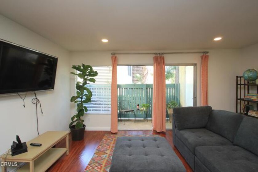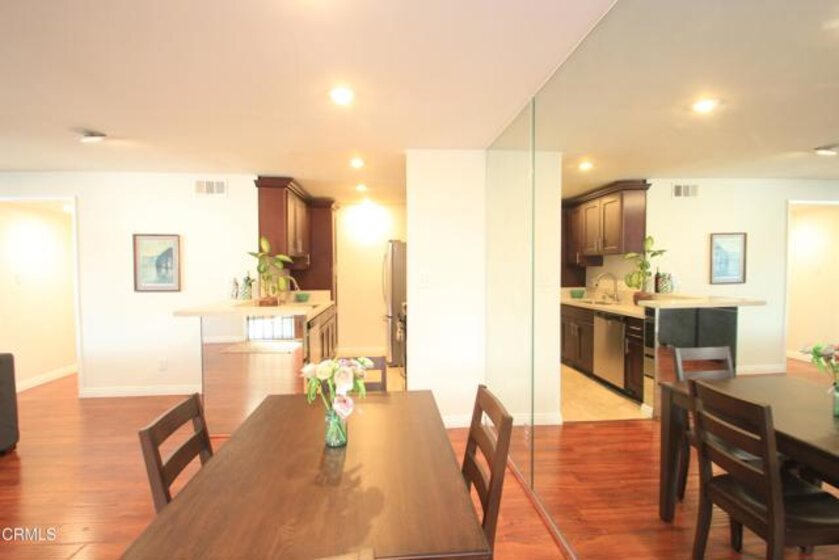 Welcome to this elegant and sophisticated single-story, ground-floor condominium featuring a thoughtfully designed floor plan and stylish updates throughout. Freshly painted interiors and beautiful wood-like flooring create a bright, inviting atmosphere from the moment you enter.The spacious living room offers plenty of room for relaxing or entertaining and opens to a cozy, private patio--perfect for enjoying morning coffee or evening breezes. The dining area is enhanced by dramatic floor-to-ceiling mirrors that reflect natural light and create an open, airy feel.The kitchen features quartz countertops, lovely cabinetry, and ample workspace for everyday cooking or hosting guests. Both the primary and secondary bathrooms have been fully updated with custom tile and stone finishes, adding a touch of luxury to the home.Bedrooms are generously sized and include mirrored closet doors and excellent storage space. A convenient hall linen closet adds additional organization.Located in a centrally situated gated community with a peaceful, park-like setting surrounded by mature, tall trees. Residents enjoy amenities including a swimming pool and convenient on-site laundry facilities. Unit features two assigned parking spaces one of which is covered.A wonderful opportunity to own a beautifully maintained home in a serene and well-located complex.