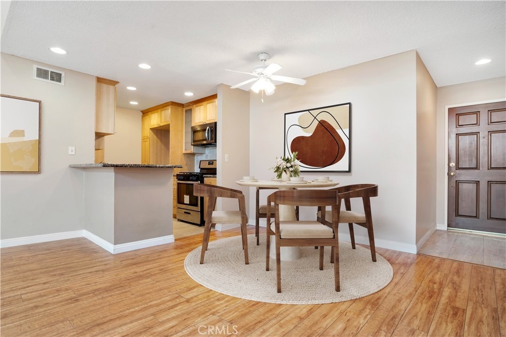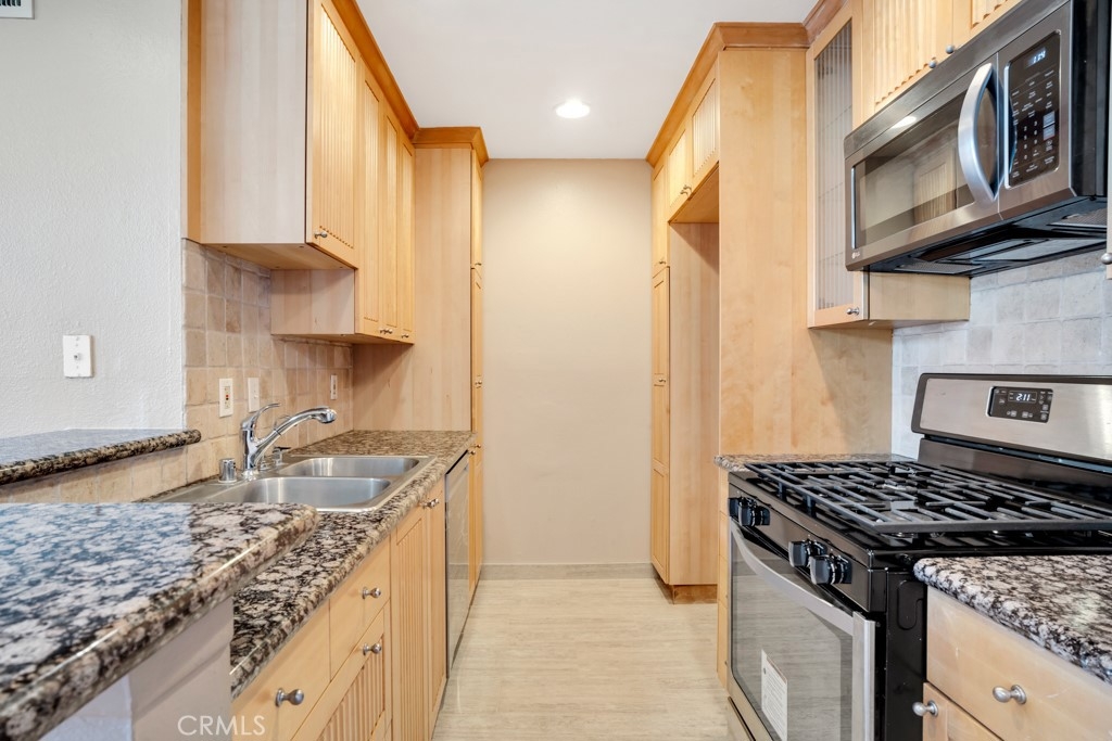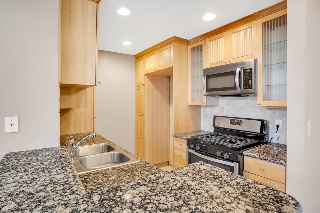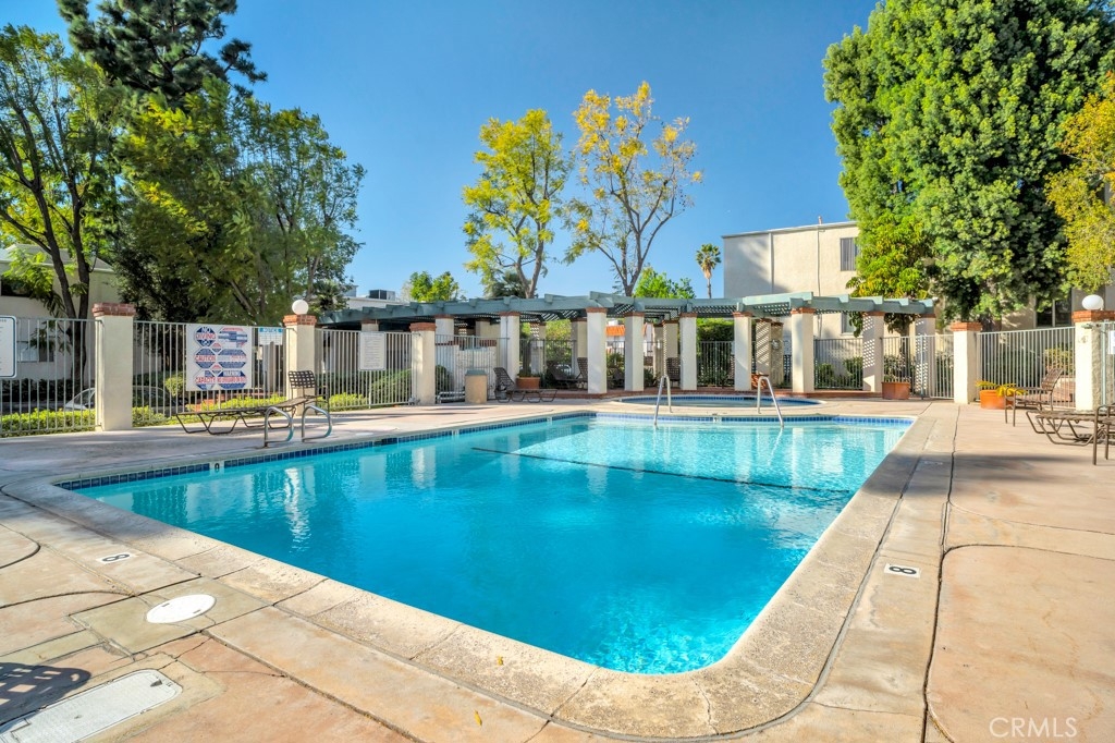 This beautifully remodeled 3 bedroom 2 bath upper unit condo is located in a gated community and offers the perfect blend of modern updates and comfortable living. Featuring an open floor plan with recessed lighting and soaring cathedral ceilings in the living room, this home is designed for both relaxation and entertainment. The kitchen is a chef's dream, boasting brand-new stainless steel appliances which include a stove, oven, dishwasher and built-in microwave, as well as sleek granite countertops, and ample cabinet space for all your storage needs. The condo offers 3 generously sized bedrooms, each equipped with ceiling fans, custom closets, and new blinds for added convenience and style. The Primary suite features an updated en-suite bathroom and the additional 2 bedrooms share a nice sized updated bathroom. Step outside to your private balcony, where you'll find additional storage space, perfect for keeping your home organized. The unit also includes two assigned parking spots for your convenience. The gated community offers great amenities, including a sparkling pool, relaxing hot tub, and a community laundry room. This prime location is just minutes from the freeway, local shopping, and some of the best dining on Ventura Blvd, offering the ultimate in convenience and lifestyle. Don't miss the opportunity to call this beautiful condo your new home!