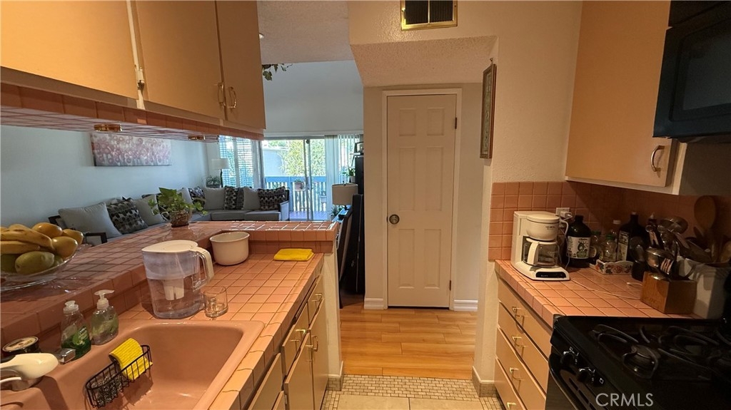 A beautiful 2 bedroom one bath, end unit, new HVAC, and dishwasher, custom stone work in the kitchen, master bedroom has a walk in closet, designer and beautiful bathroom with sky light fan and heater, a large balcony with view of courtyard unobstructed by any other units, feel a serene of peace and quiet, 2 parking spaces, move in condition and mirrored living room.