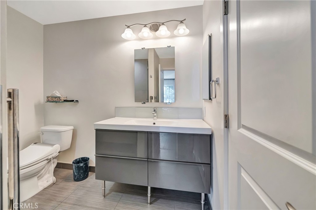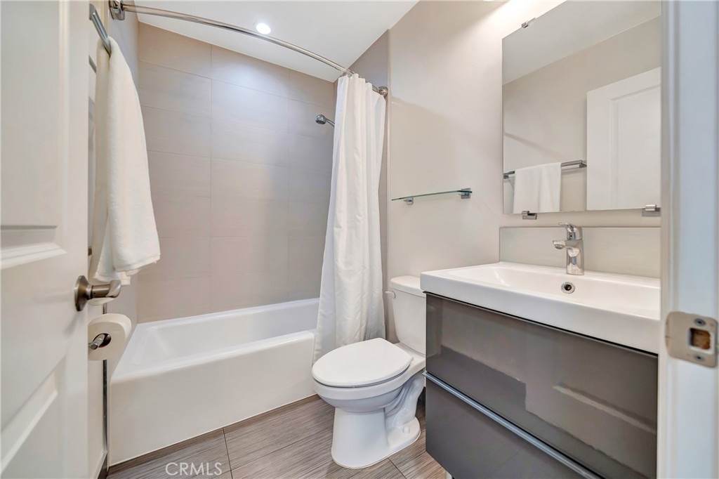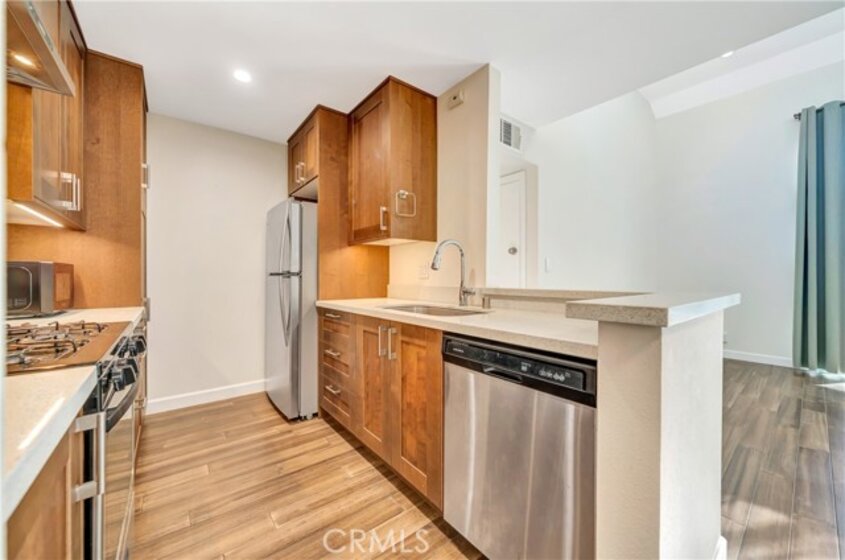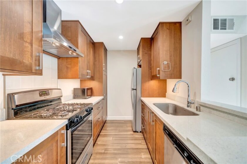 Beautifully remodeled top-floor condominium in the heart of Tarzana. This light-filled home features soaring high ceilings in the living room and an open, airy layout enhanced by abundant natural light throughout. The modern kitchen showcases shaker-style natural wood cabinetry, sleek quartz countertops, and a clean contemporary design—perfect for both everyday living and entertaining. Wood flooring flows throughout the home, complemented by smooth ceilings and recessed lighting in every room for a polished, upscale feel. The primary bedroom offers a private en-suite bathroom and a large closet with custom organizers. A second bedroom and a fully remodeled second bathroom complete the ideal floor plan. Smooth ceilings with recessed lighting throughout. With two bedrooms, two bathrooms, and a prime top-floor location, this turnkey condo combines style, comfort, and convenience for a perfect blend of modern upgrades and elegant living. The unit was extensively remodeled in 2019 which included a new HVAC system! Conveniently located in close proximity to Cedar Sinai-Providence Medical Center, shopping and trendy restaurants, transportation, houses or worship and all the very best that Tarzana has to offer. Recent special assessment has been paid by the seller! This is a great value and is priced for a quick sale. Hurry, before its gone!