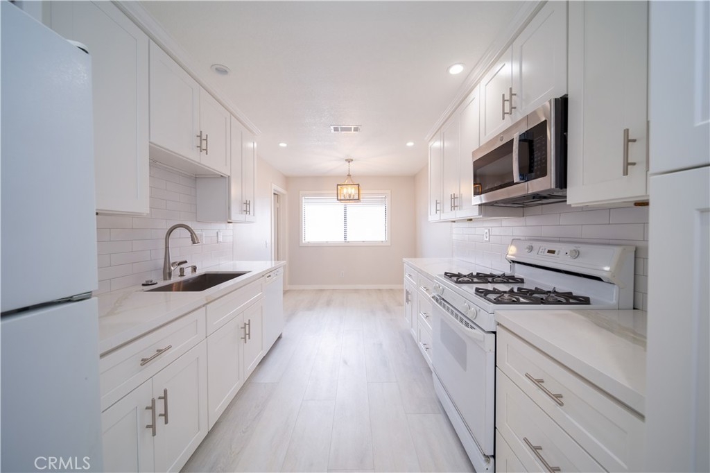 Beautiful three bedroom, three bath townhouse with large 2-car attached garage and upgraded features throughout. This spacious home boasts new flooring throughout, remodeled modern kitchen cabinets with stunning quartz countertops, in kitchen dining space, perfect for hosting guests or enjoying family meals. The main floor features a spacious family room with a cozy fireplace and sliding glass door that leads to an enclosed patio, perfect for relaxing or entertaining. Overlooking the family room is a large formal dining space with a built-in dry bar. Both upper bedrooms are spacious with their own on-suite bathrooms and ample closet space. The primary suite includes a private balcony, offering additional space to enjoy the outdoors and beautiful grounds. The lower bedroom is a converted office space, perfect for your work at home needs. This townhouse complex features refreshing pools/spa, gym, and clubhouse, all set within impeccably maintained grounds. Don't miss out on this wonderful opportunity to own this stunning townhouse, schedule your showing today!